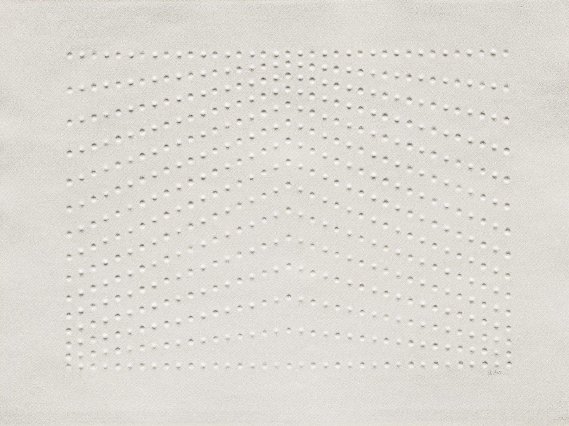 dry impression, cm. 45x60, signed and stamped dry on the bottom right, non-numbered work belonging to the edition of 100, as expressed in writing in the archive "copy of this edition, signed but not numbered". Published in the volume: "Enrico Castellani Graphic Work 1960-1995" (Corraini Editore, Mantua 1996), detailed at number 11.