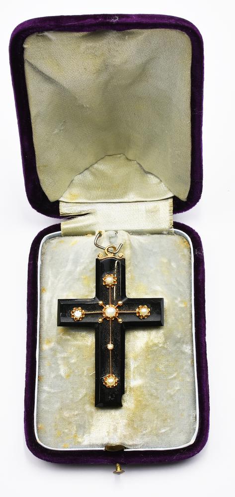 PENDENTE A FORMA DI CROCE IN PIETRA DURA CON ELEMENTI IN ORO ROSSO A BASSA CARATURA E PICCOLE PERLE