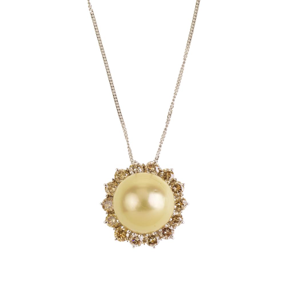 PENDENTE IN ORO BIANCO, PERLA SOUTH SEA GOLD E DIAMANTI FANCY