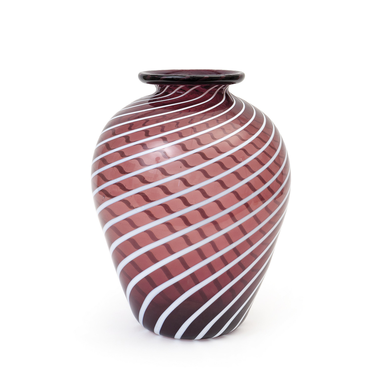 Un vaso in vetro trasparente ametista con canne ritorte lattimo modello '1871' circa 1927.