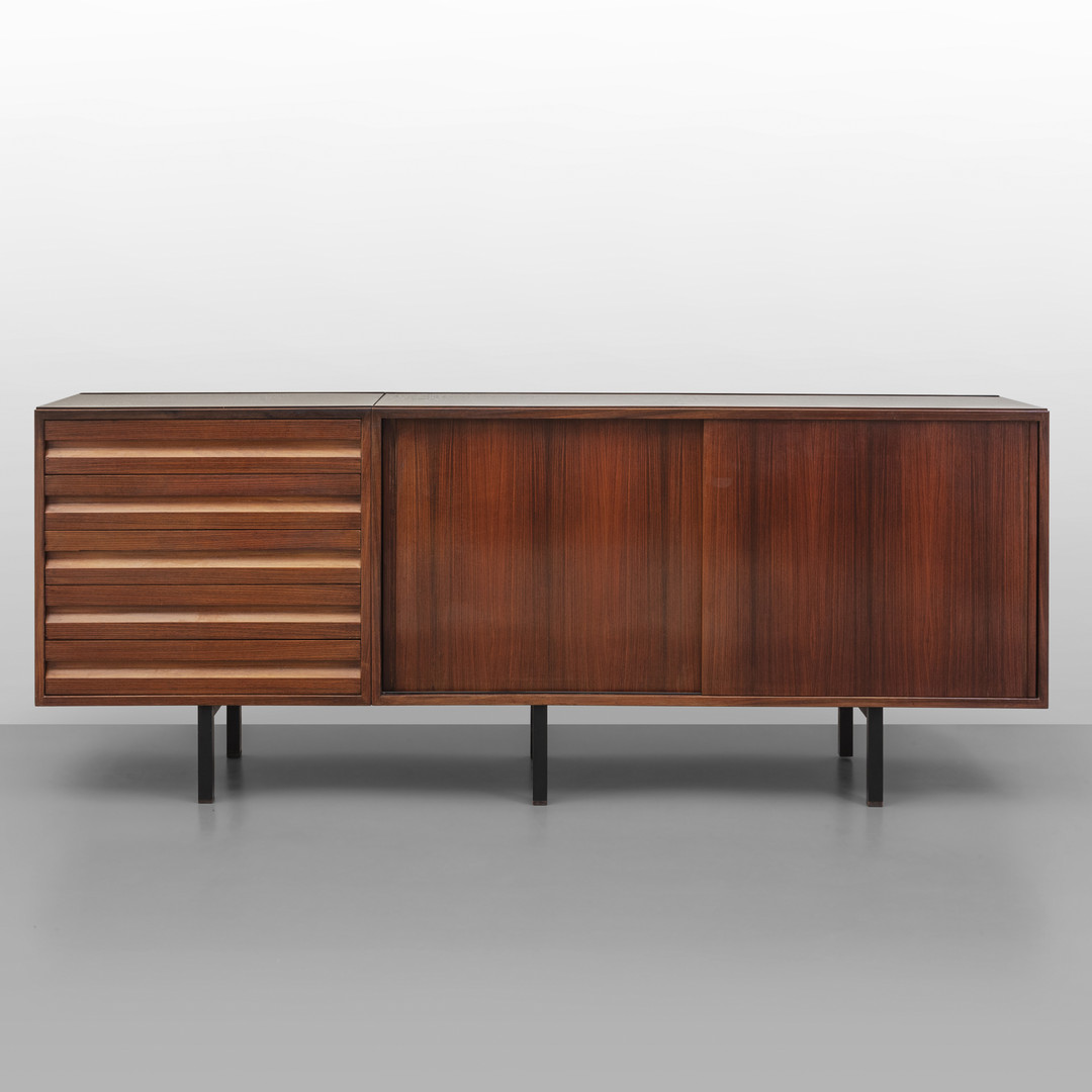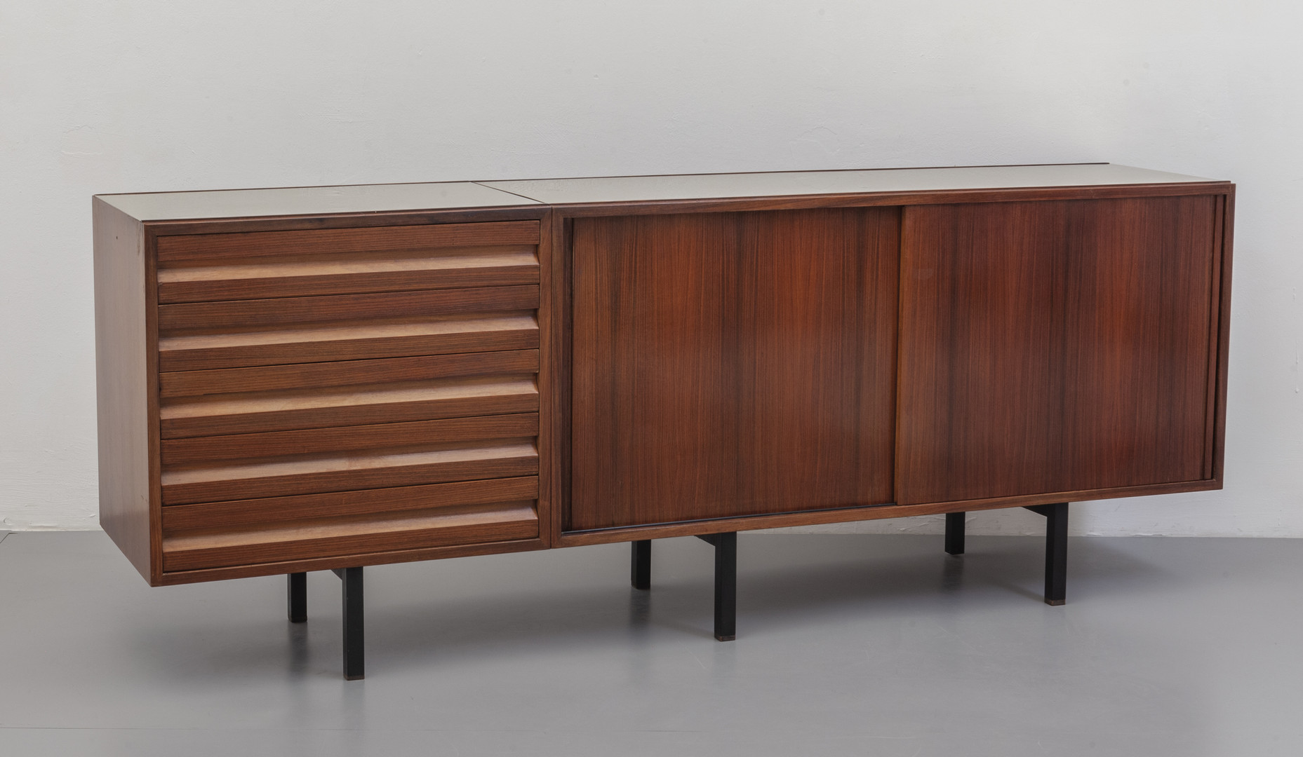 Una credenza della serie 'SE' per TECNO 1962. Composta da un modulo SE1 (a cassetti) e da un modulo SE3 doppio (ad ante scorrevoli).