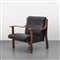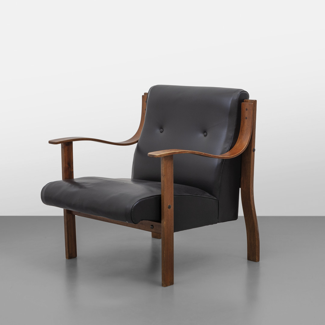 curved laminated walnut wood and vinyl upholstery.
