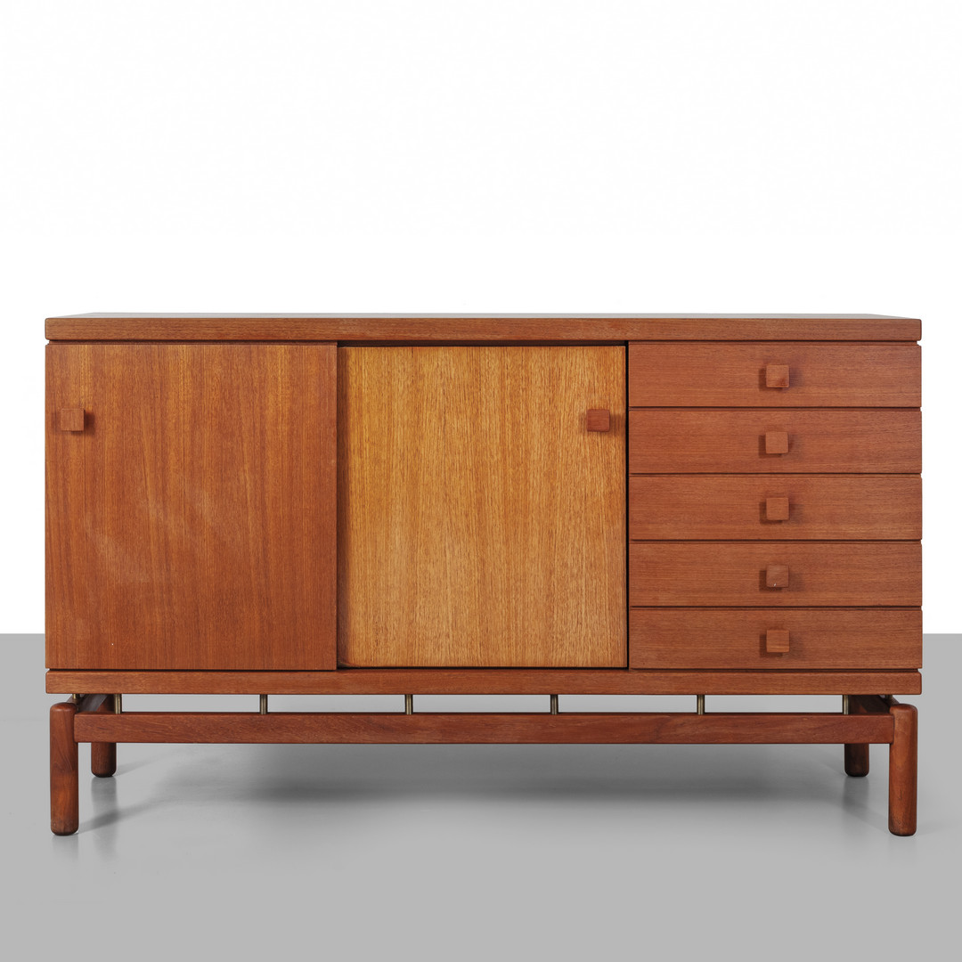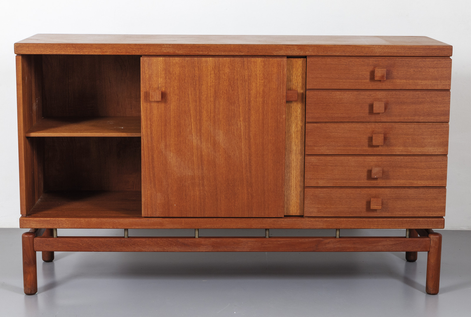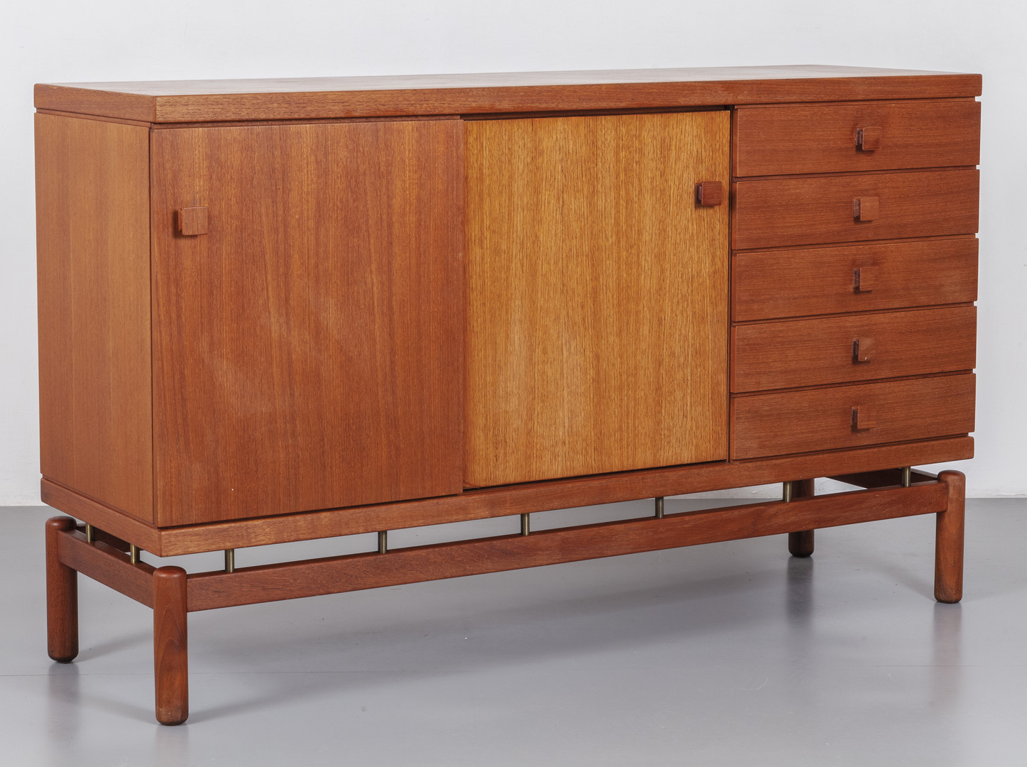 Teak wood teak veneered wood and brass. Manufacturer's label.