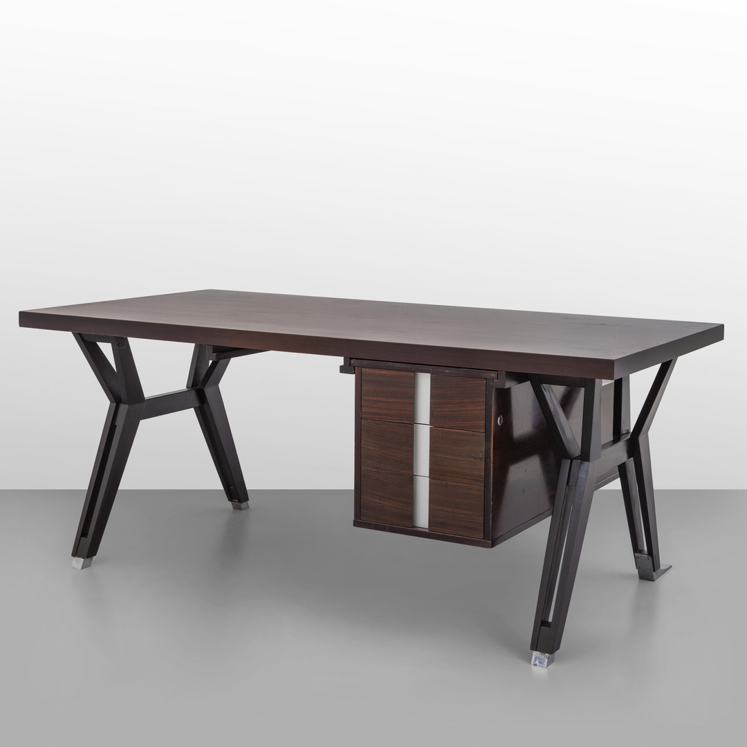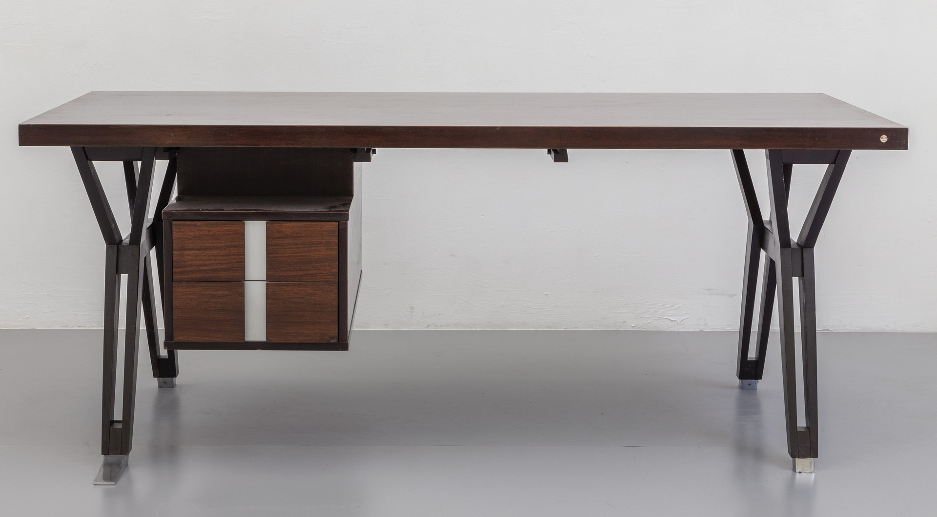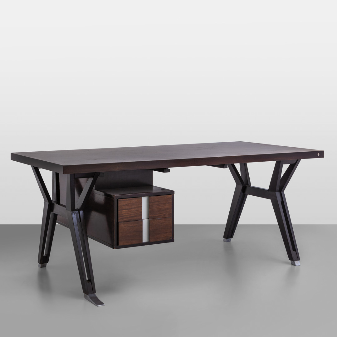 Legno di palissandro legno impiallacciato in palissandro piedini di metallo nichelato maniglie dei cassetti di alluminio spazzolato.