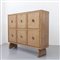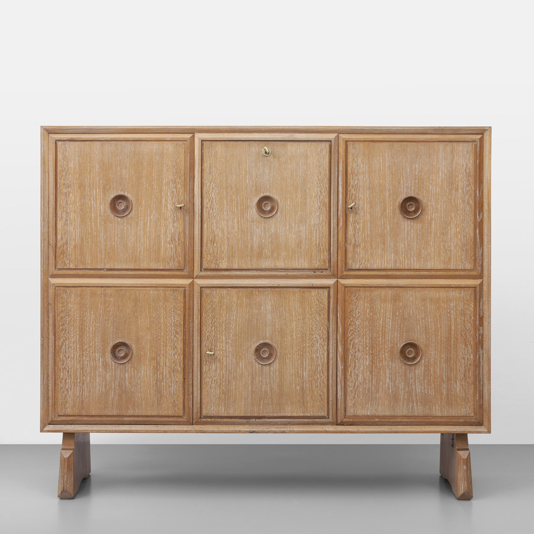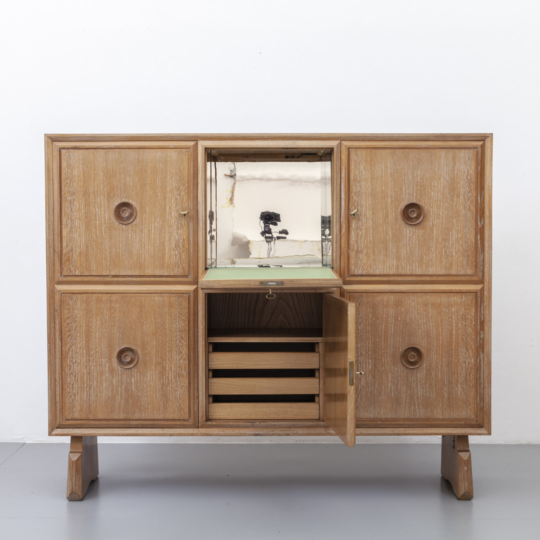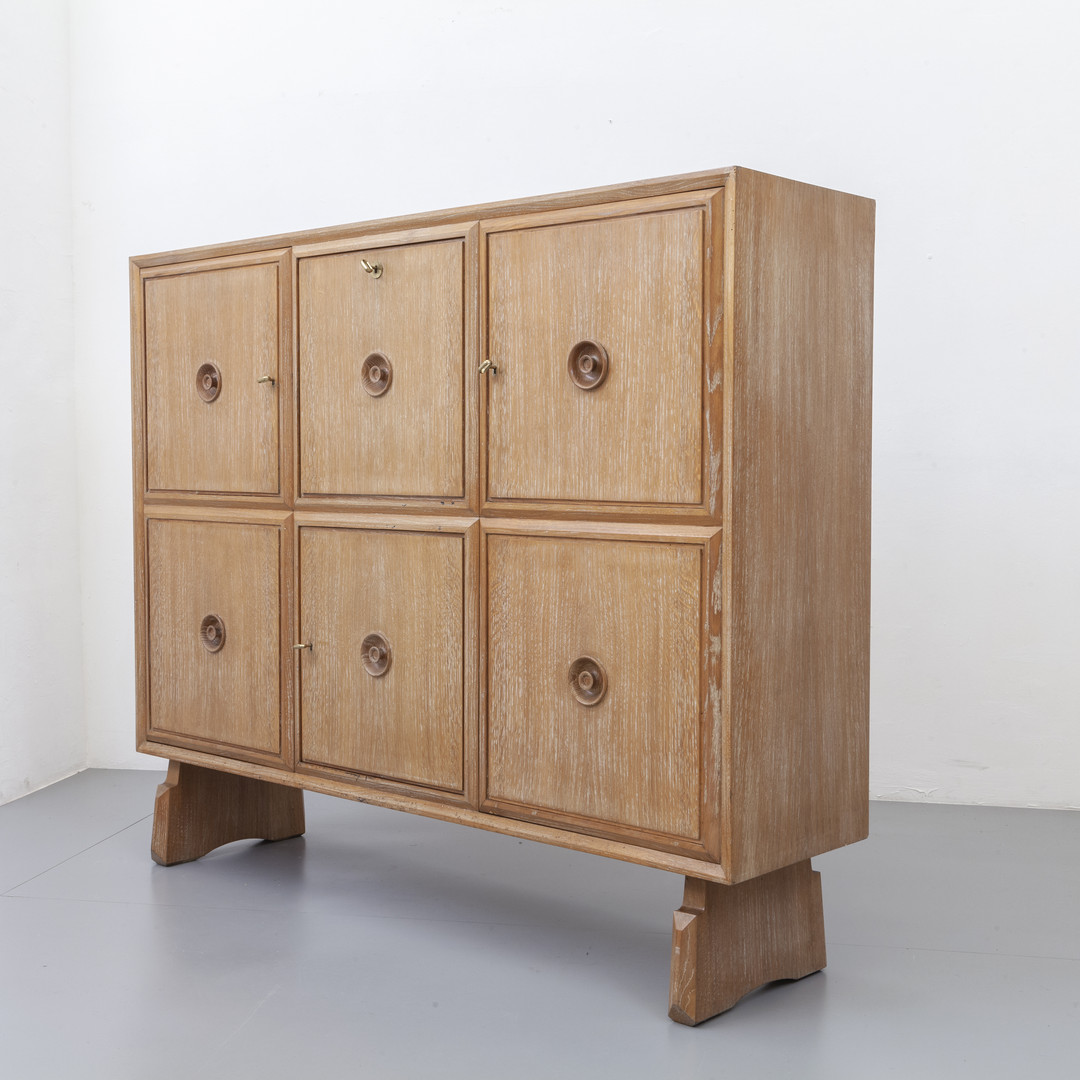Oak wood. Bar compartment coated with retro painted glass and mirrored glass.