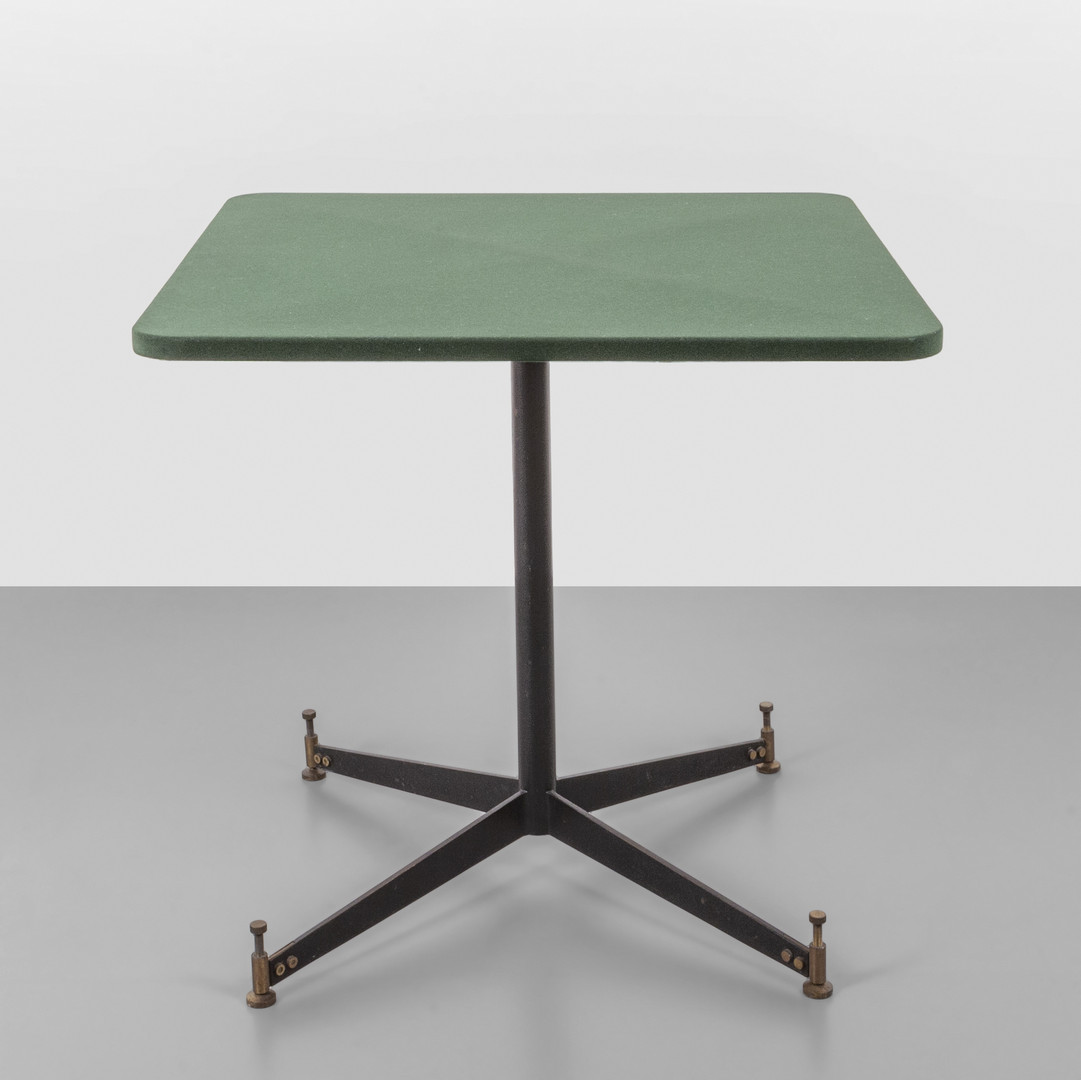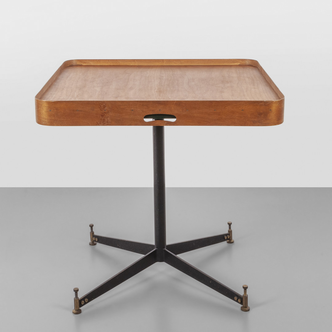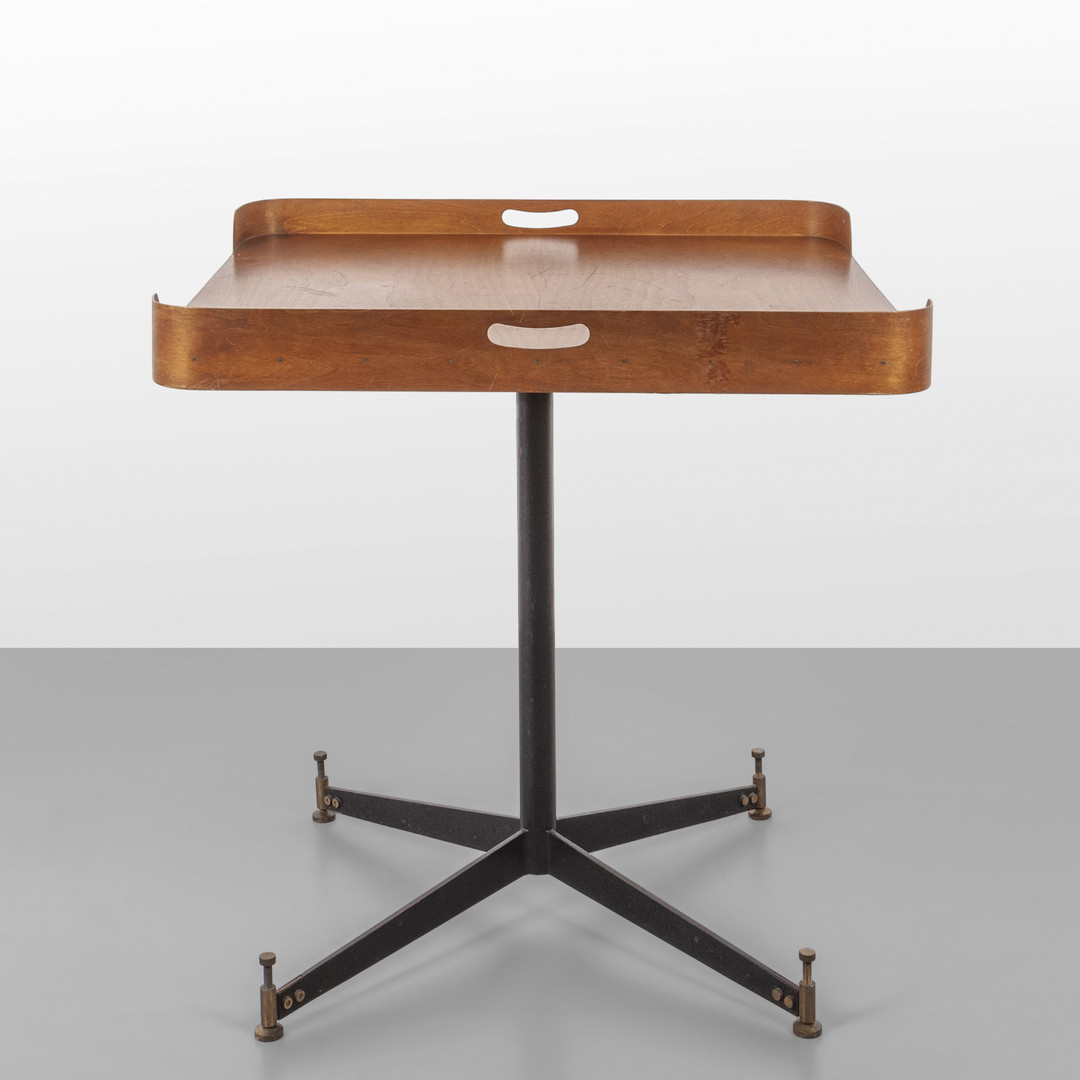 Varnished steel adjustable brass feet wood coated with cloth with a walnut veneered removable tray.