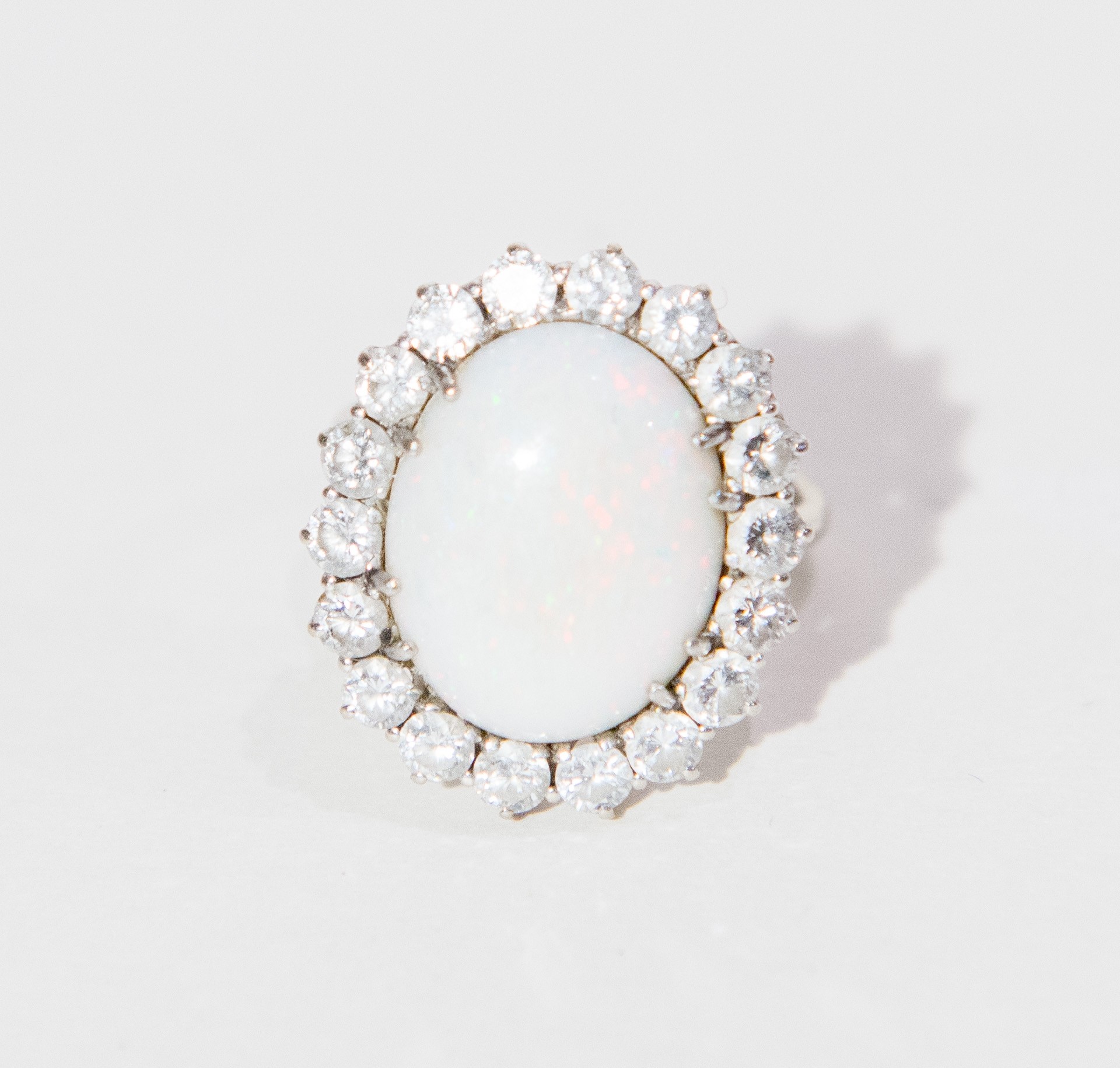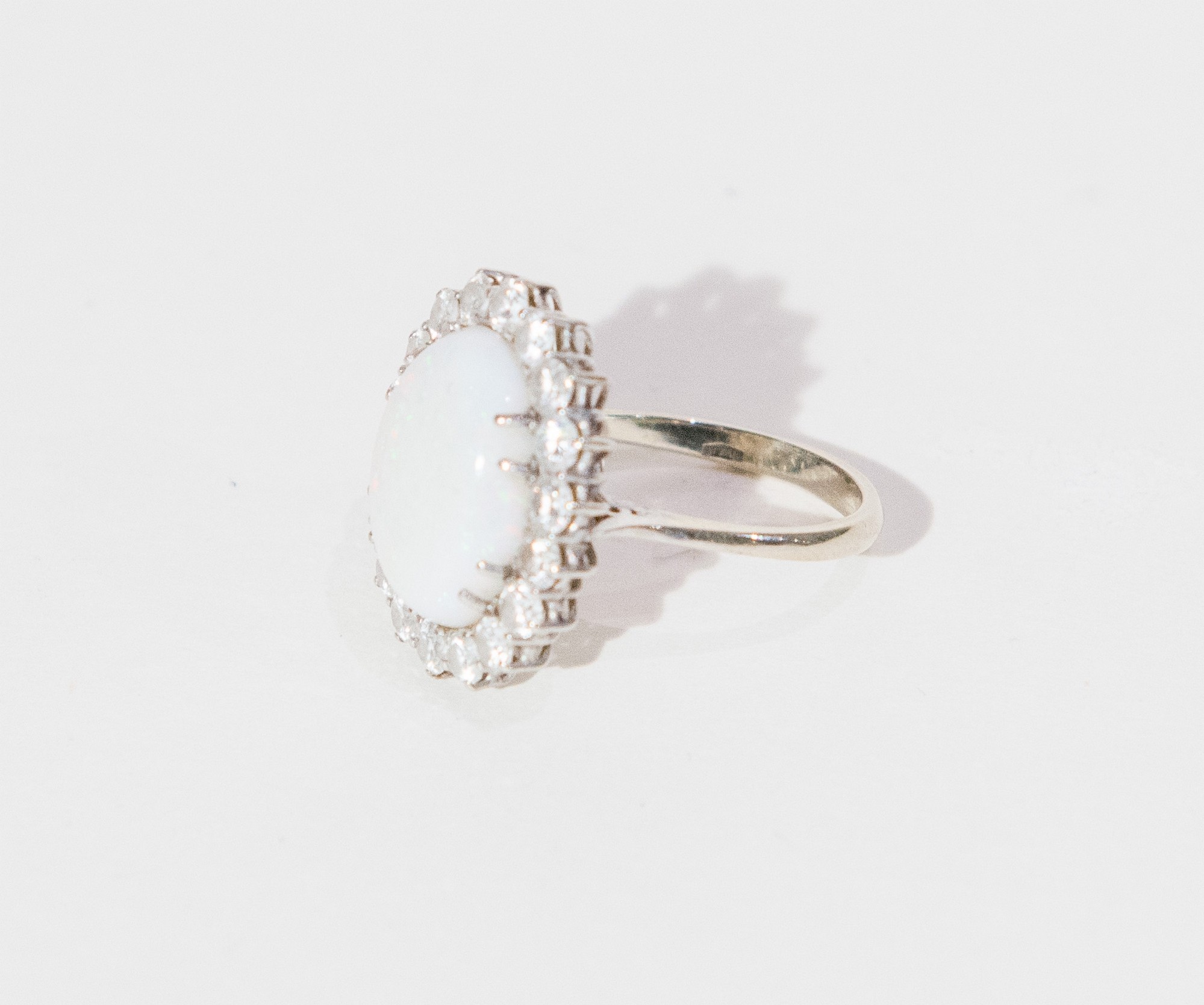 ANELLO IN ORO BIANCO 18K Decorato con cabochon ovale di opale nobile bianca posto entro cornice di brillanti (peso stimato 1.62 carati). Peso complessivo 6,86 grammi.