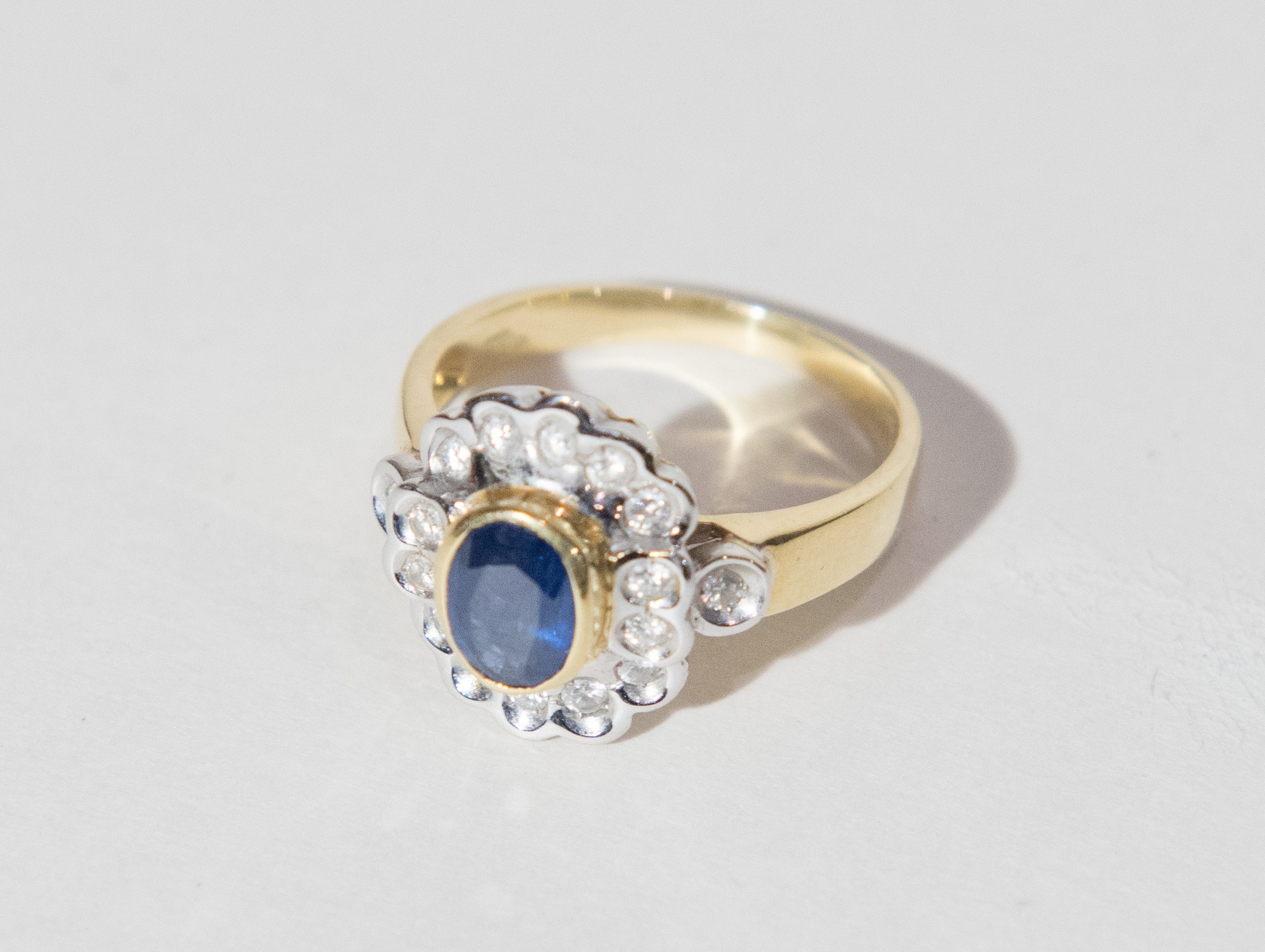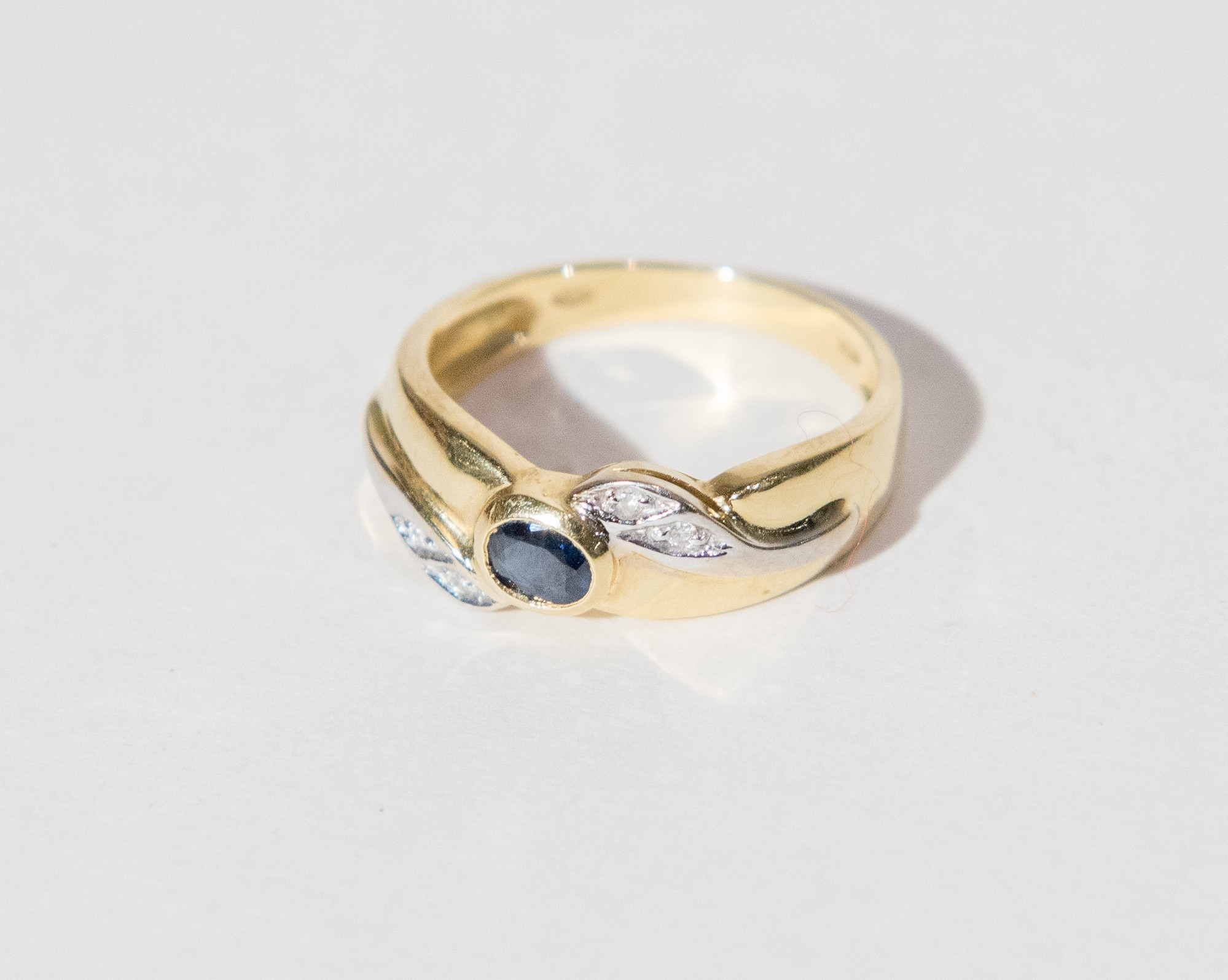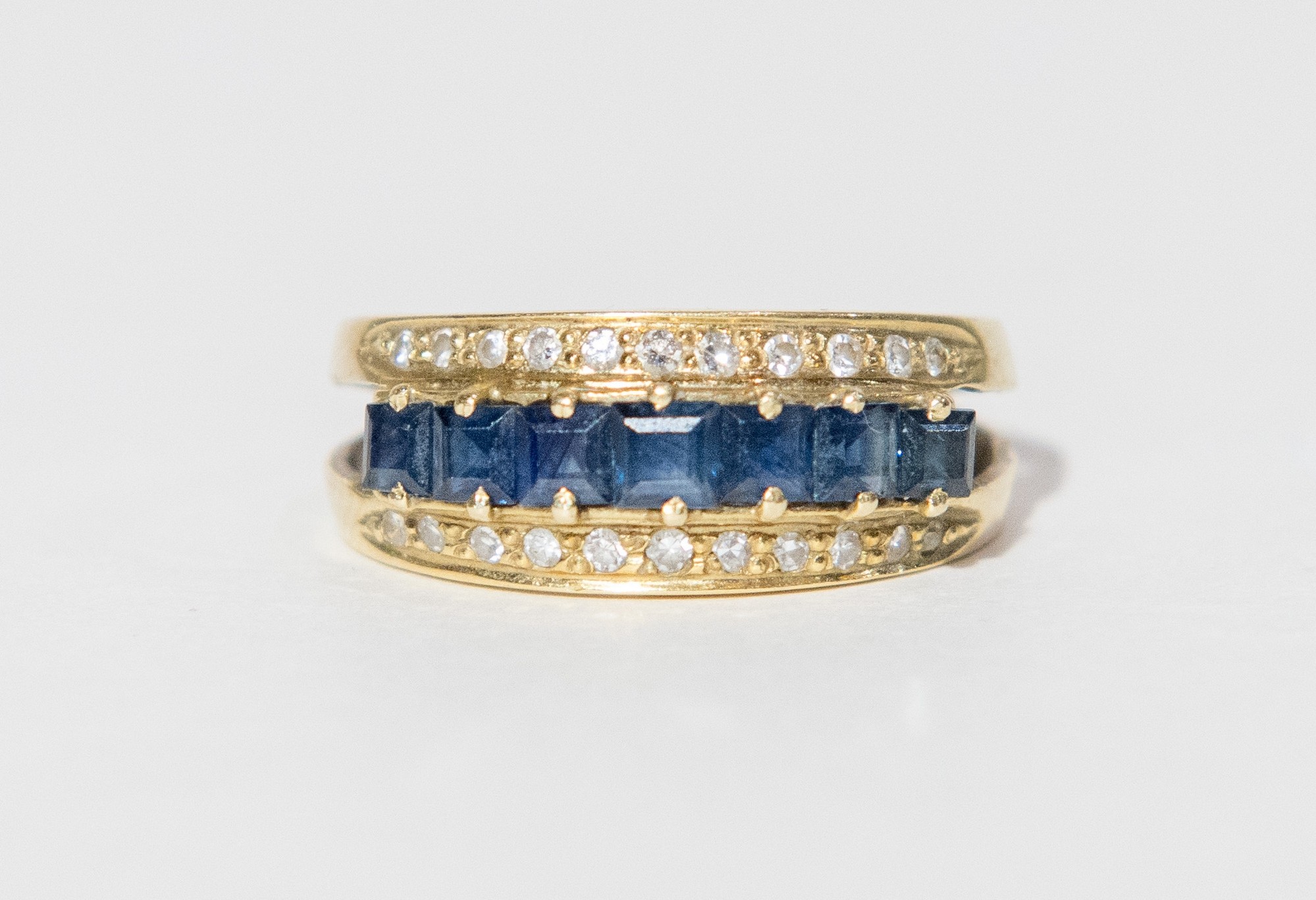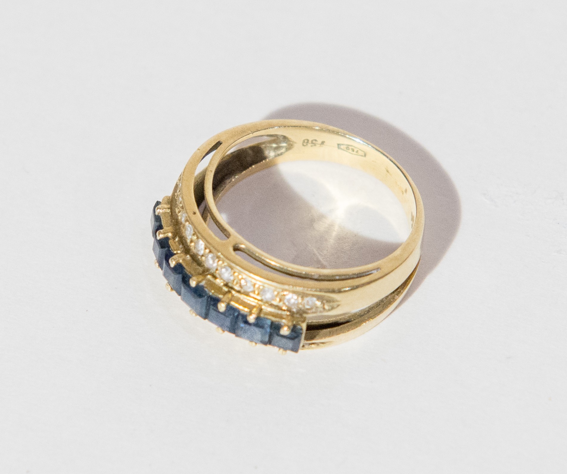 TRE ANELLI IN ORO GIALLO E BIANCO 18K Decorati con diamanti e zaffiri blu.