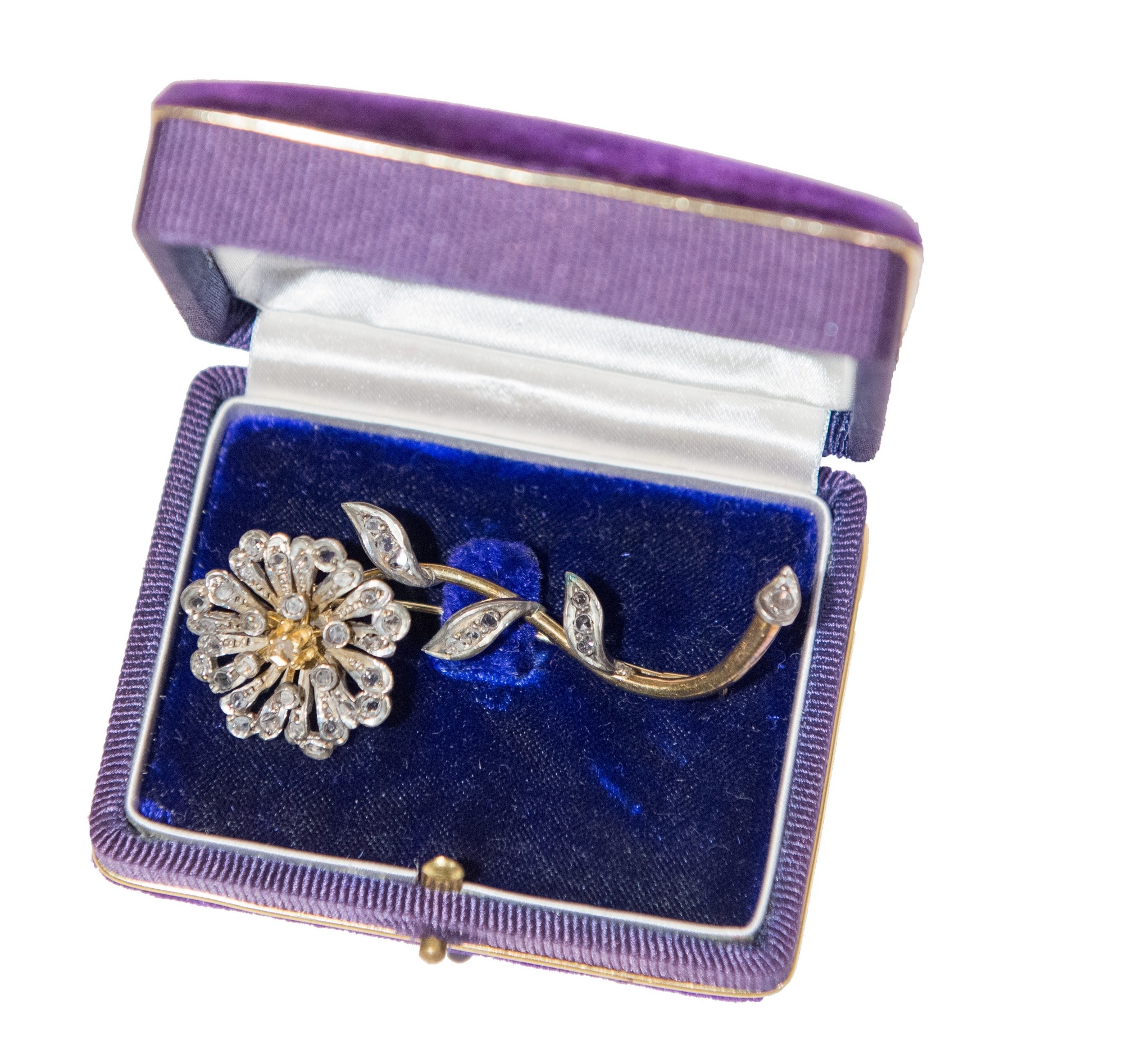 SPILLA IN ARGENTO E ORO A BASSO TITOLO Realizzata come un tralcio fiorito decorato da piccoli diamanti a rosa. Peso complessivo 14,45 grammi.