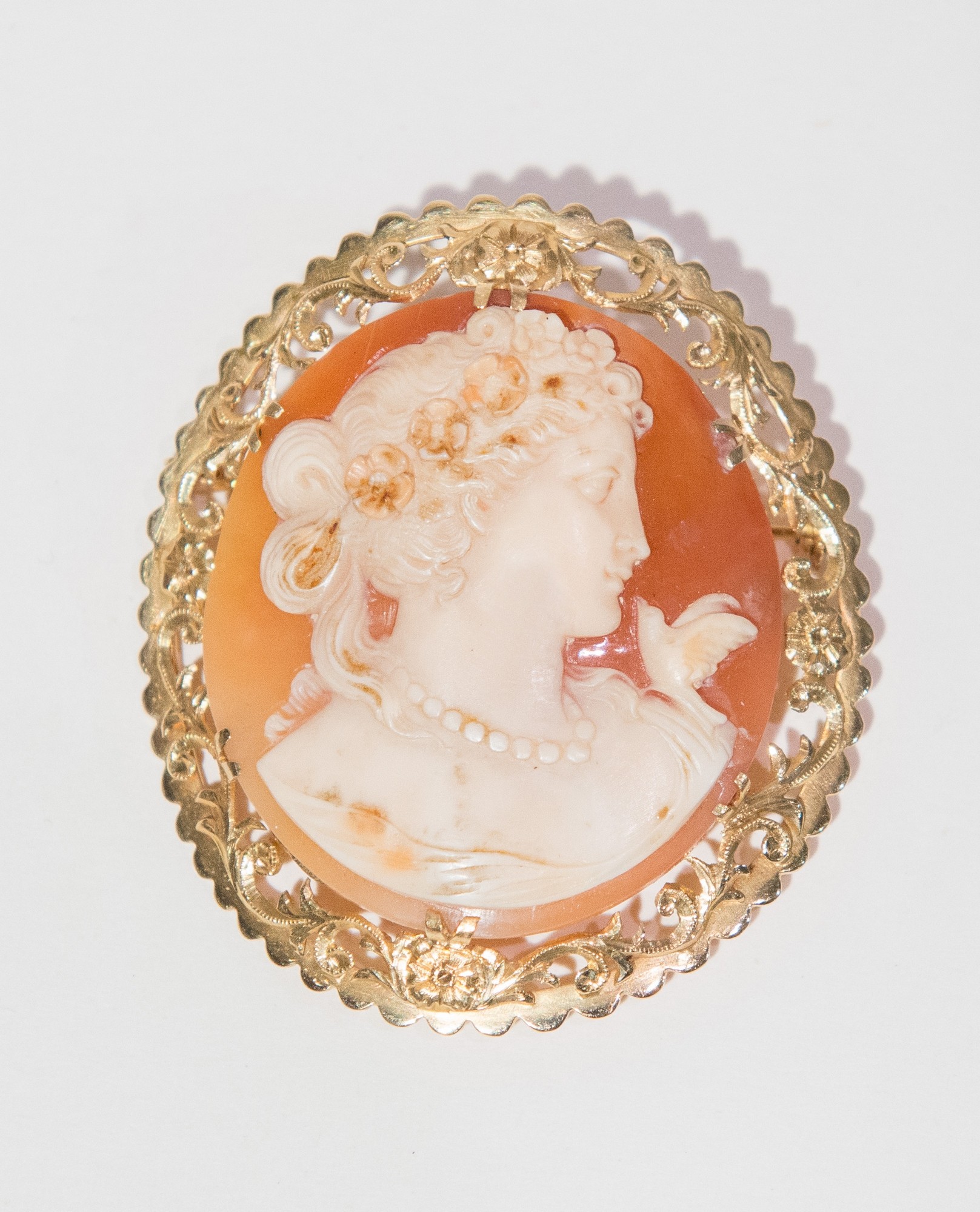 SPILLA CAMEO Realizzata con cameo in conchiglia raffigurante profilo femminile riconducibile alla “Flora” del Tiziano, racchiuso entro cornice a racemi in oro 18K. Peso complessivo 16,76 grammi.
