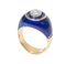 ANELLO IN ORO GIALLO 18K SMALTATO Realizzato come una fascia decorata con smalto blu e centrata da diamante e cuscino di vecchio taglio. Peso complessivo 11,89 grammi. (Difetti)