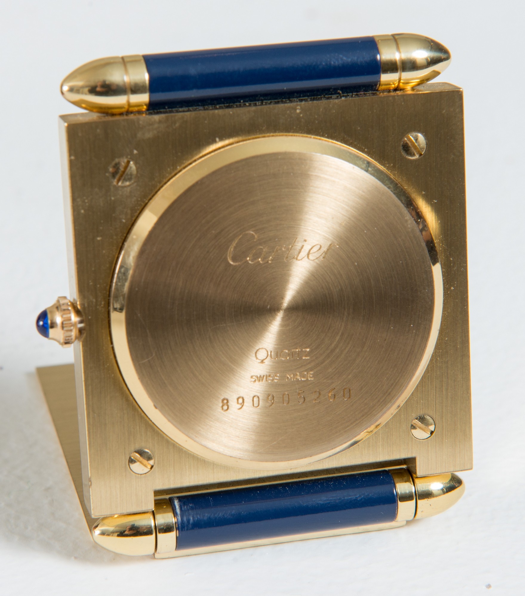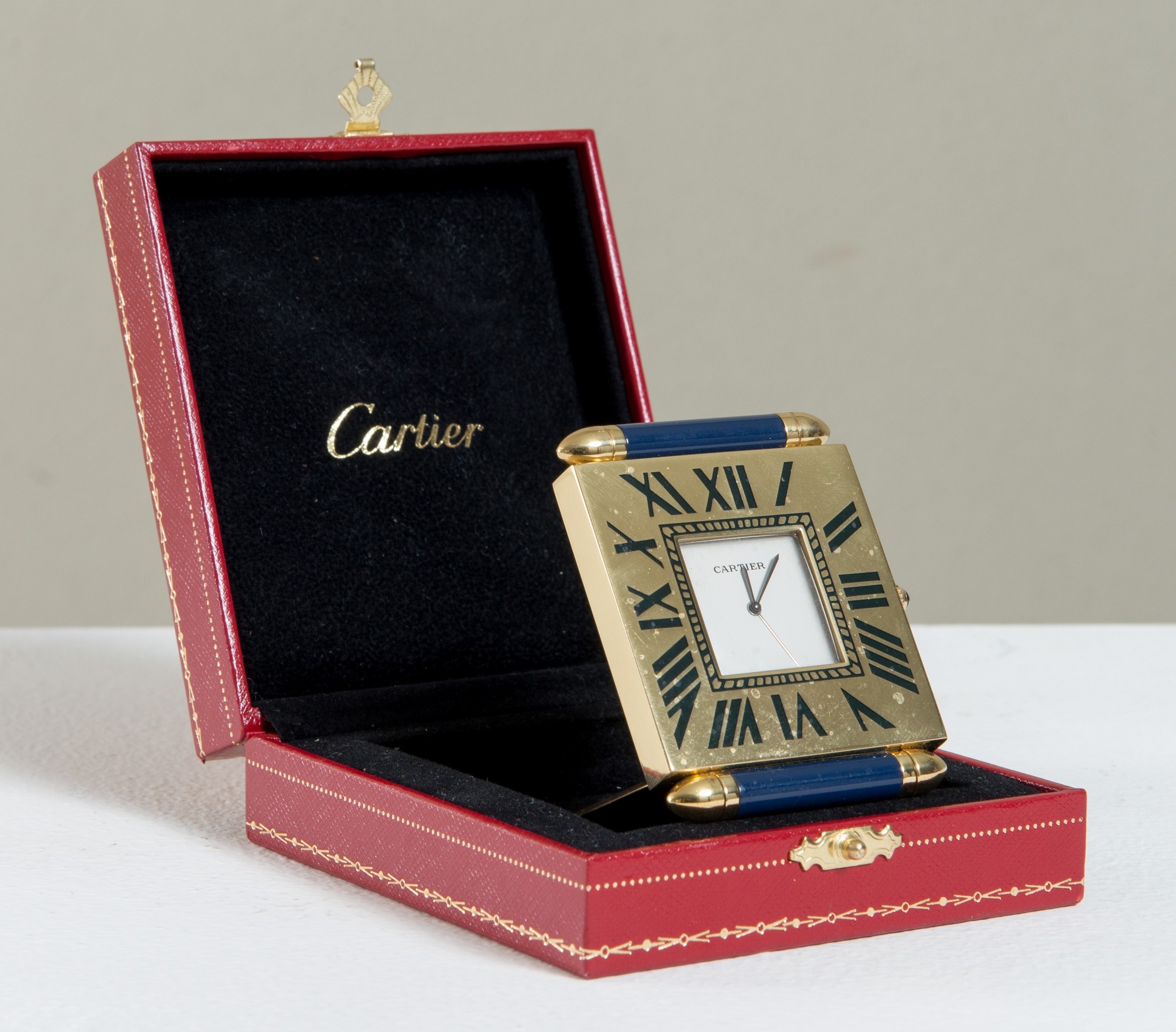 OROLOGIO DA TASCA CARTIER Orologio/sveglia da tasca, scrivania e viaggio Carre’ Obus Alarm Clock. 1999. Cassa quadrata in acciaio placcato in oro e blu, carica in quarzo. Quadrante in acciaio placcato in oro e bianco con numeri arabi, coperto da sportellino in acciaio dorato con cerniera. Oggetto custodito all’interno della sua custodia originale in pelle rossa. Cm 6,3x5x0,6. Quadrante: Lato cm 4,9; Numero di serie: 890905260. Sul quadrante e al retro reca marchi e numero di serie.