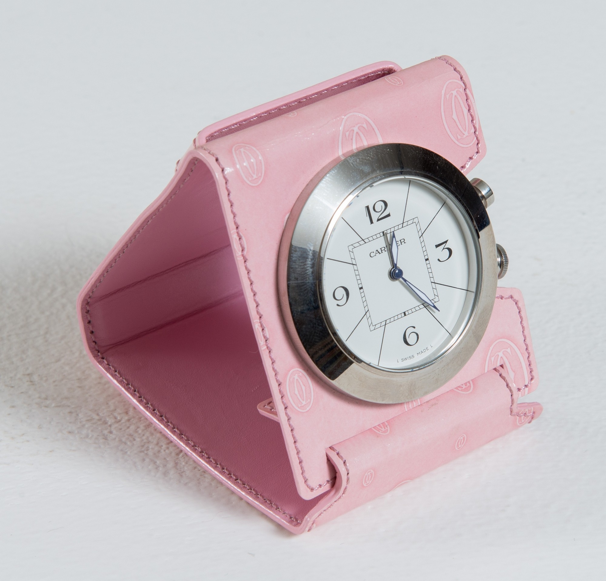 OROLOGIO DA TASCA CARTIER Orologio/sveglia da tasca, scrivania e viaggio Swisse made Pacha. Cassa rotonda e lunetta in acciaio, carica al quarzo. Quadrante bianco rotondo con numeri arabi. Rivestimento in pelle rosa con loghi. Sul quadrante reca con dicitura “Cartier L Swiss Made L”. Al retro reca marchio e numero di serie. Cm 7x5,7x1,5; Diametro cassa: Cm 4,5; Numero di serie: 700684 AL 302.