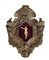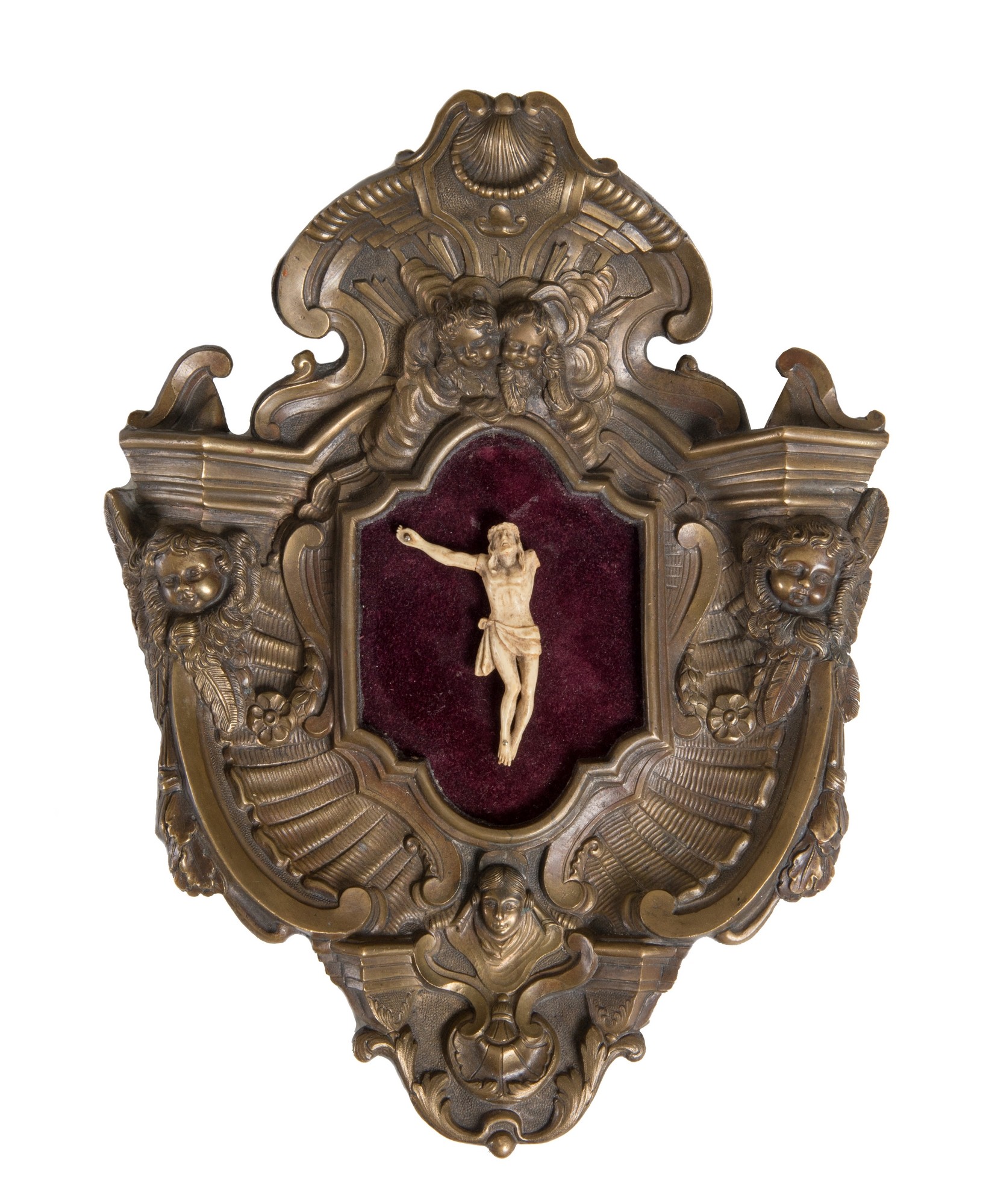 ARGENTERIA e OREFICERIA STEFANI, attr. XX secolo Crocifisso in avorio montato su lastra rivestita in velluto bordeaux entro cornice in bronzo decorata con putti e ornamenti vegetali e architettonici. Cm 29x22,5. (difetti