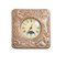 OROLOGIO DA TAVOLO LIBERTY, Germania, XX secolo Sveglia/orologio da tavolo a forma quadrata con angoli arrotondati. Parte frontale in argento sbalzato con raffigurazione di due figure femminili, elementi architettonici e floreali. Quadrante dell’orologio con numeri romani e fasi lunari. Retro rivestito in velluto verde. Marchiato e punzonato alla base G.R. 2 8, 925. Cm 15x15x3; Diametro quadrante: Cm 7,5.
