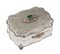 COFANETTO PORTA GIOIE, XX secolo Cofanetto rettangolare polilobato in argento con lumeggiature dorate. Cesellato con elementi ornamentali vegetali e puntinature. Coperchio con apertura a cerniera ribaltabile e presa in argento dorato, decorato con un cabochon di pietra dura verde a taglio ovale. Interno in argento dorato. Alla base vi sono quattro piedini di appoggio in argento lavorati a motivi ornamentali vegetali. Sotto la base reca punzone 800. Peso complessivo: 191 gr. Cm 4,4x10,3.
