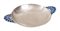 CIOTOLA IN ARGENTO, XX secolo Realizzata in argento 800, di forma circolare con prese laterali decorate con smalto blu. Sotto la base reca punzoni. Peso: 227 gr. Cm 3,5x22,4; Diametro: Cm 16,3.