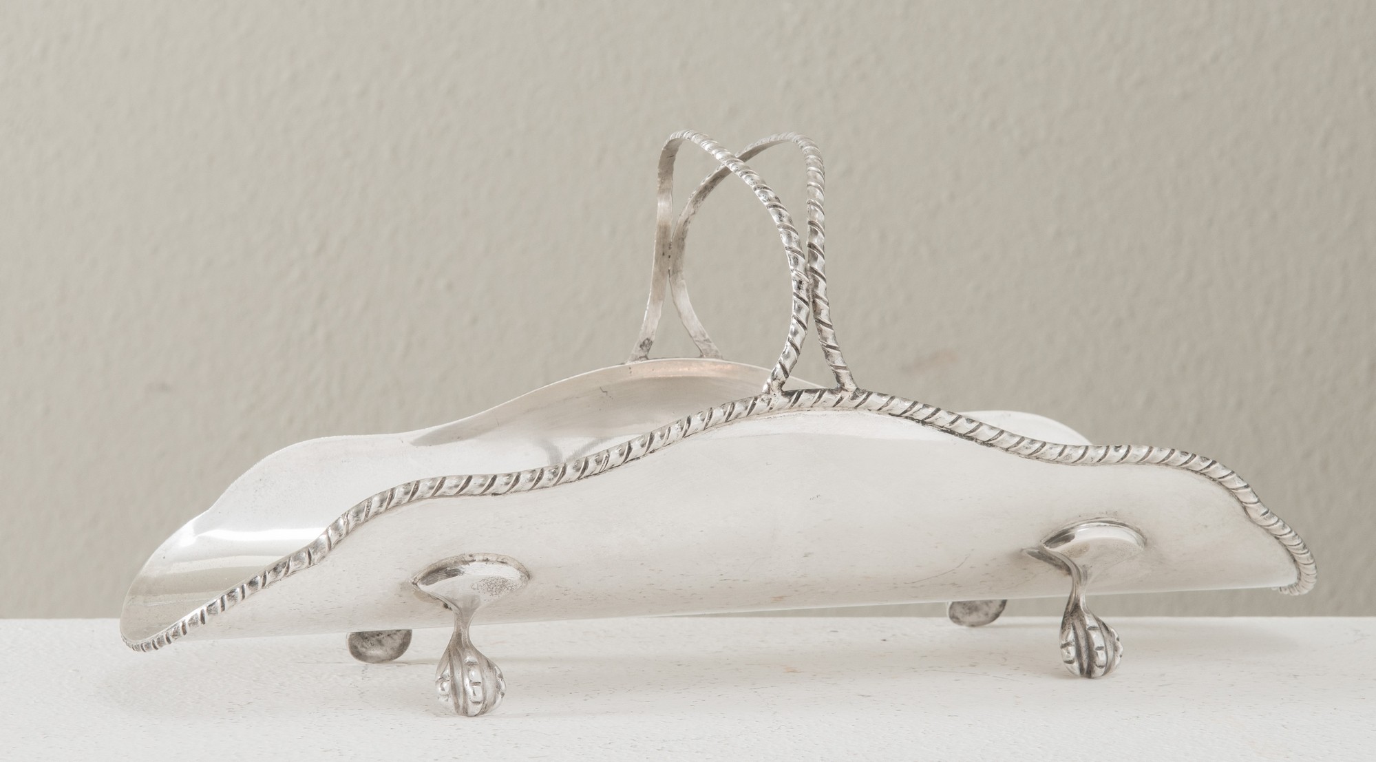 PORTAGRISSINI IN ARGENTO Realizzato in argento 800 e di forma ovale, poggiante su quattro piedini ferini, bordo e manico decorati con motivo a spirale. Alla base reca punzoni. Peso: 240 gr. Cm 25,7x8x11,5.