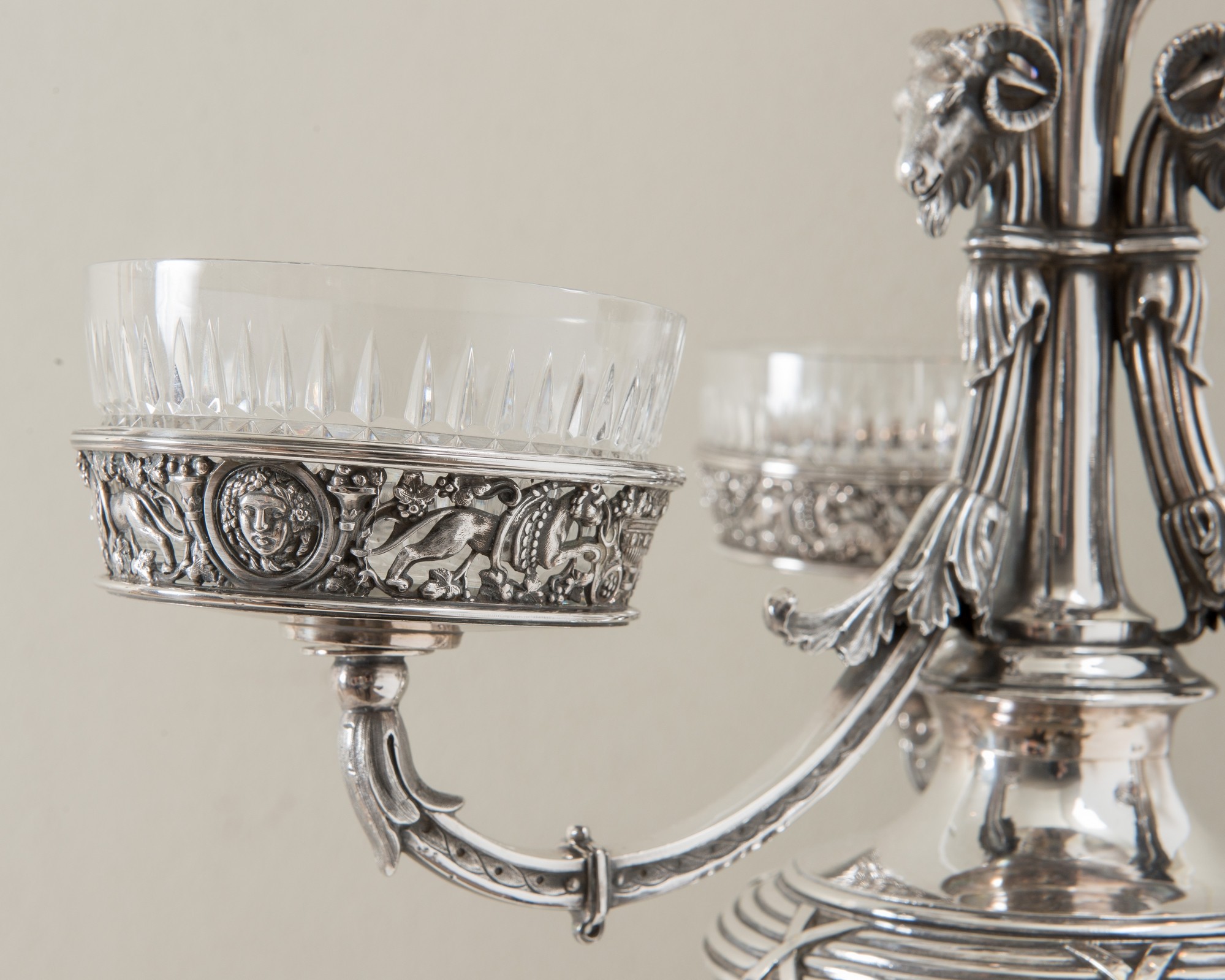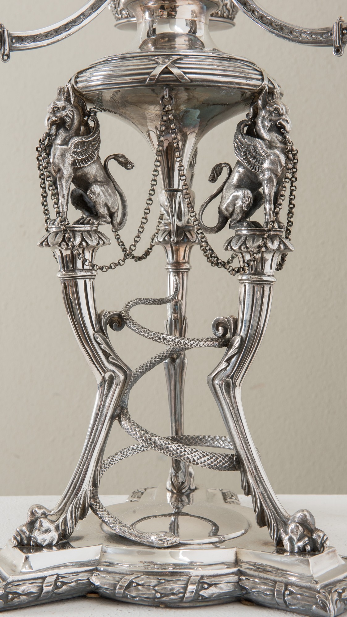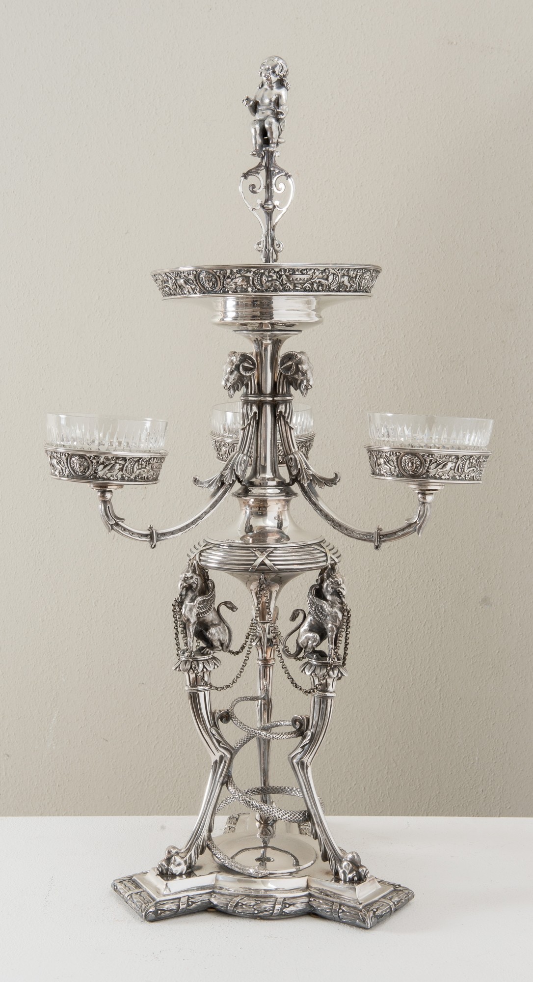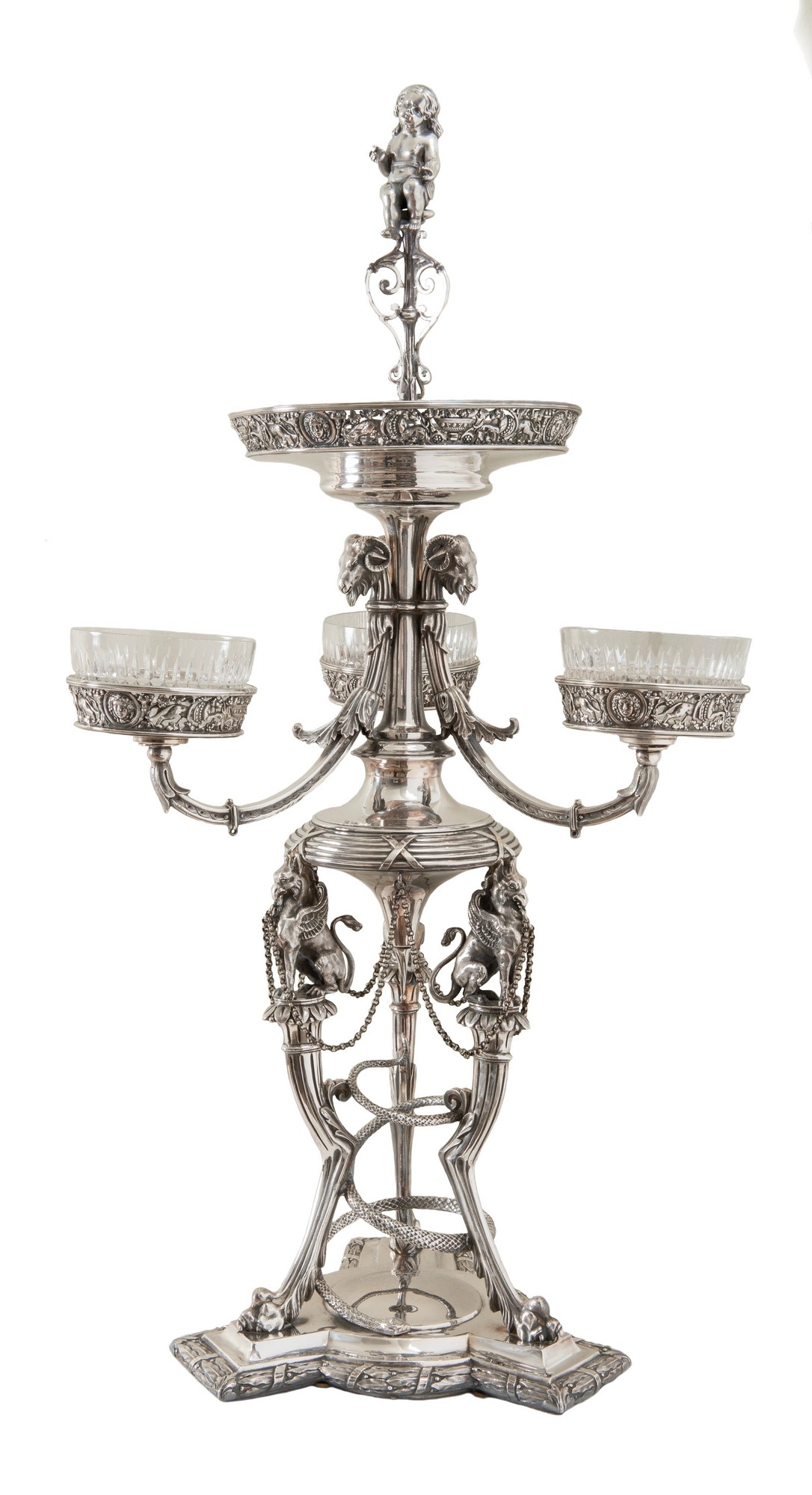 FABERGÈ, Mosca, fine del XIX secolo Importante epergnè in argento. Coppa superiore circolare con bordo traforato e sbalzato ornato da teste, fiere e ghirlande e sormontata da presa a foggia di putto, sorretta da tre teste d’oriente da cui si dipartono tre bracci culminati con tre vasche in cristallo; corpo centrale sorretto da grifoni poggianti su tre sostegni ferini uniti da serpente attorcigliato, base mistilinea ornata da decori floreali, punzoni Bollo con le insegne imperiali - Fabergè - PB 1891 - 84 - Mosca. Peso: gr. 4586. H. cm 72x39x39.