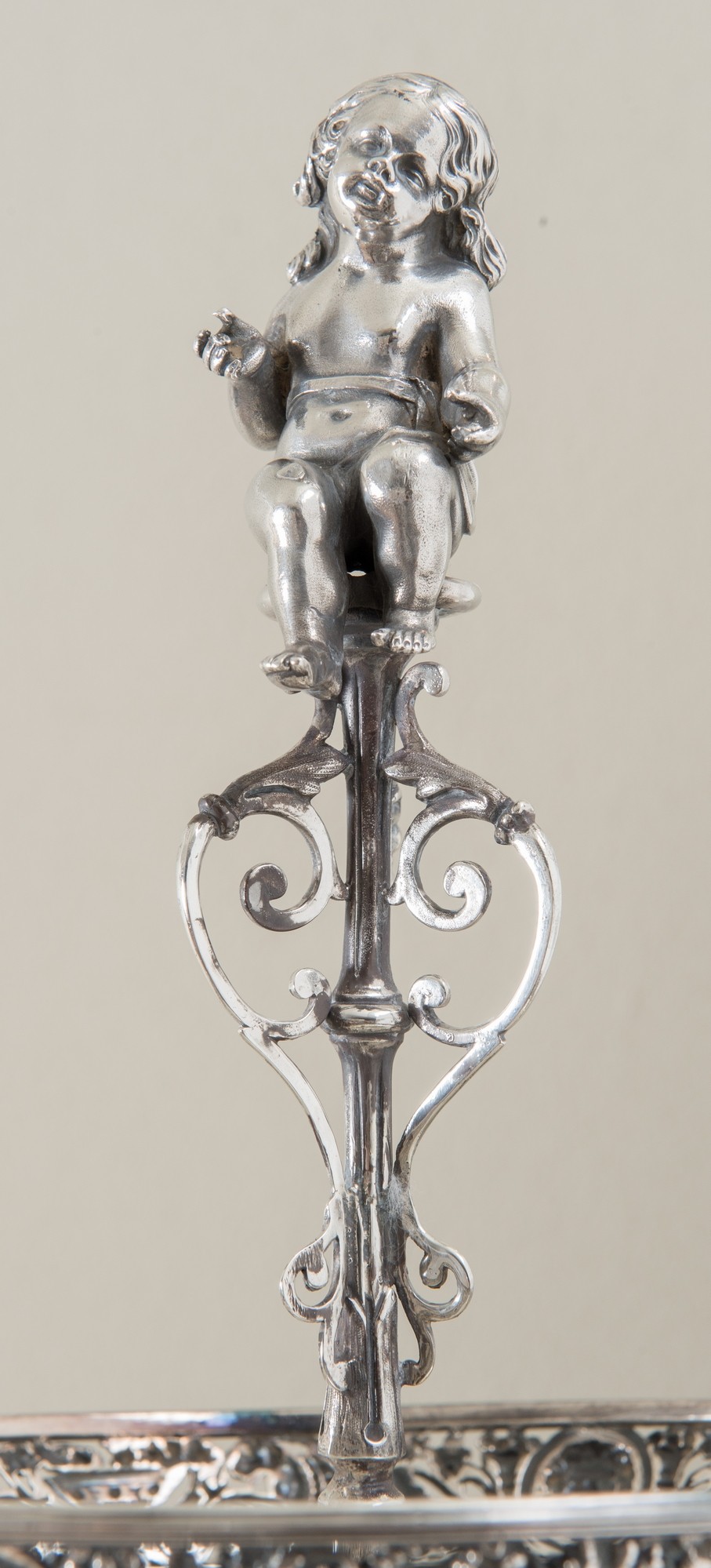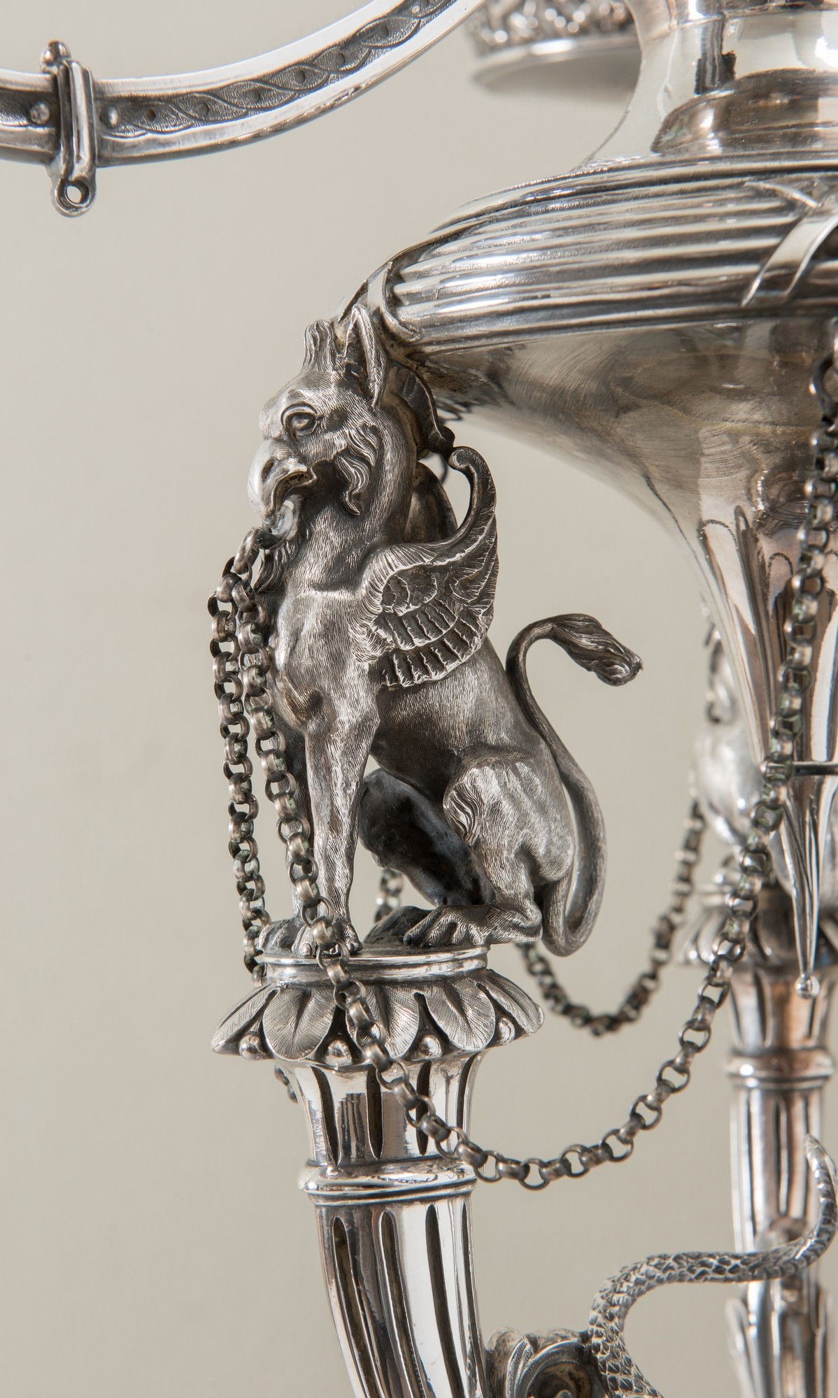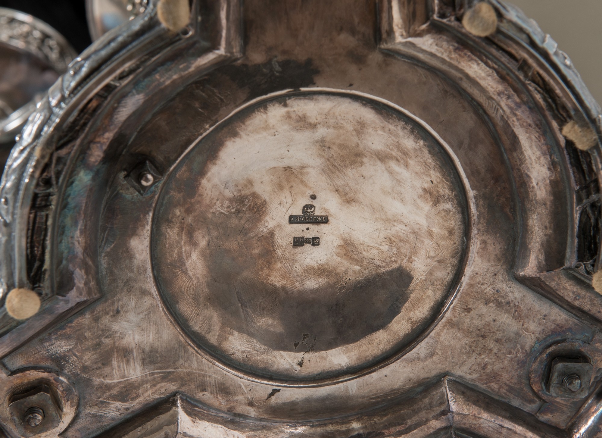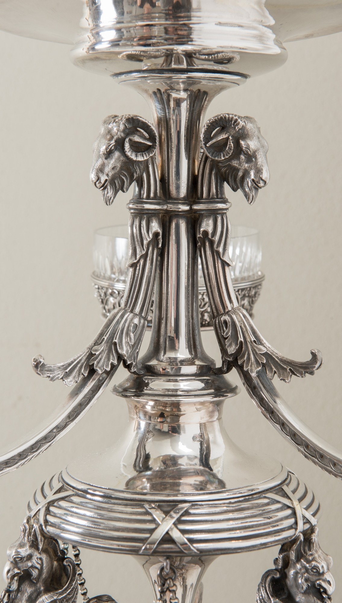 FABERGÈ, Mosca, fine del XIX secolo Importante epergnè in argento. Coppa superiore circolare con bordo traforato e sbalzato ornato da teste, fiere e ghirlande e sormontata da presa a foggia di putto, sorretta da tre teste d’oriente da cui si dipartono tre bracci culminati con tre vasche in cristallo; corpo centrale sorretto da grifoni poggianti su tre sostegni ferini uniti da serpente attorcigliato, base mistilinea ornata da decori floreali, punzoni Bollo con le insegne imperiali - Fabergè - PB 1891 - 84 - Mosca. Peso: gr. 4586. H. cm 72x39x39.