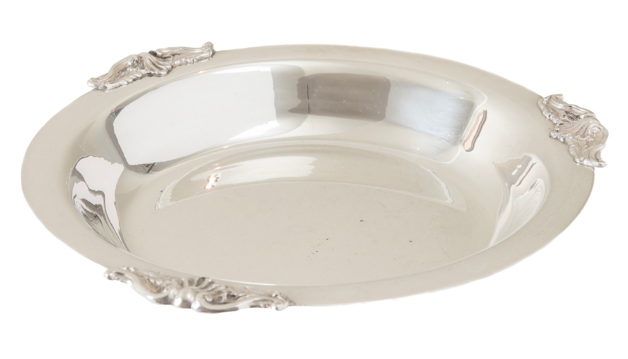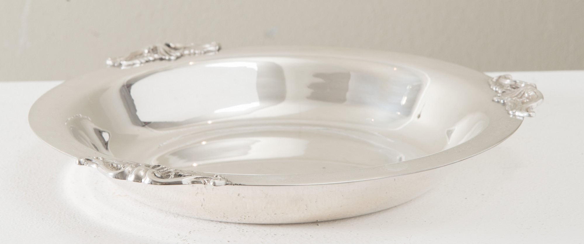ARGENTERIA e OREFICERIA STEFANI, XX secolo Svuotatasche/piatto in argento 800, con tre prese lavorate a motivi fogliacei. Sotto la base reca marchio, provenienza e punzoni: Stefani – BO – 9BO - 800. Peso 392 gr. Diametro cm 28.