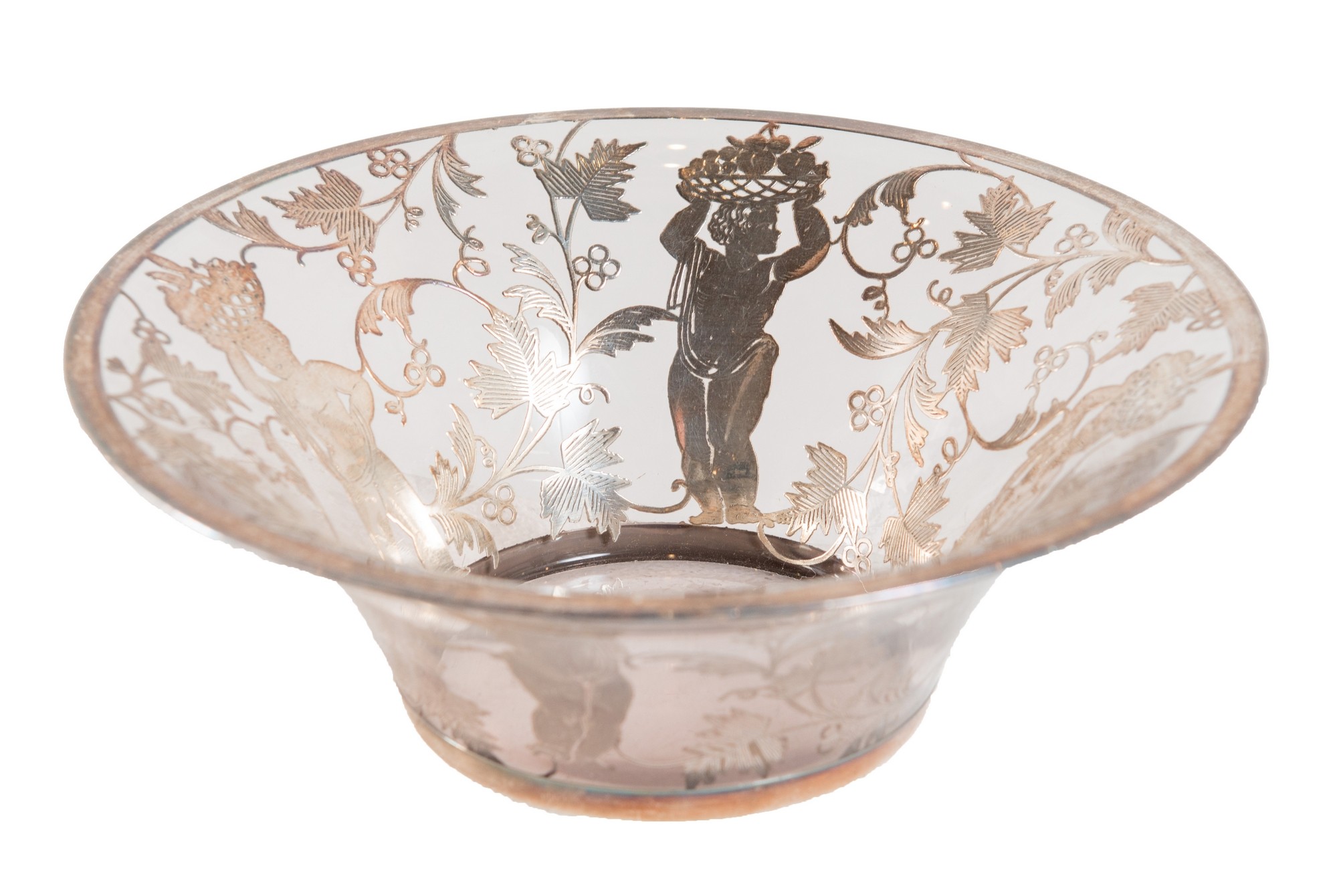 PORTA BONBON, XX secolo, anni Trenta. Realizzato in cristallo e argento, decorato con motivi di putti e tralci d'uva. Argento lavorato a traforo e poi montato sul cristallo. Cm 7,5; diametro cm 21.