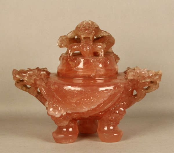 Firmato. Vaso con coperchio in giada rosa scolpita con teste di drago. Cina....