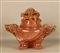 Firmato. Vaso con coperchio in giada rosa scolpita con teste di drago. Cina. Inizi XX secolo. Difetti. Mis. Lung. cm. 22 Alt. cm. 18 ca.