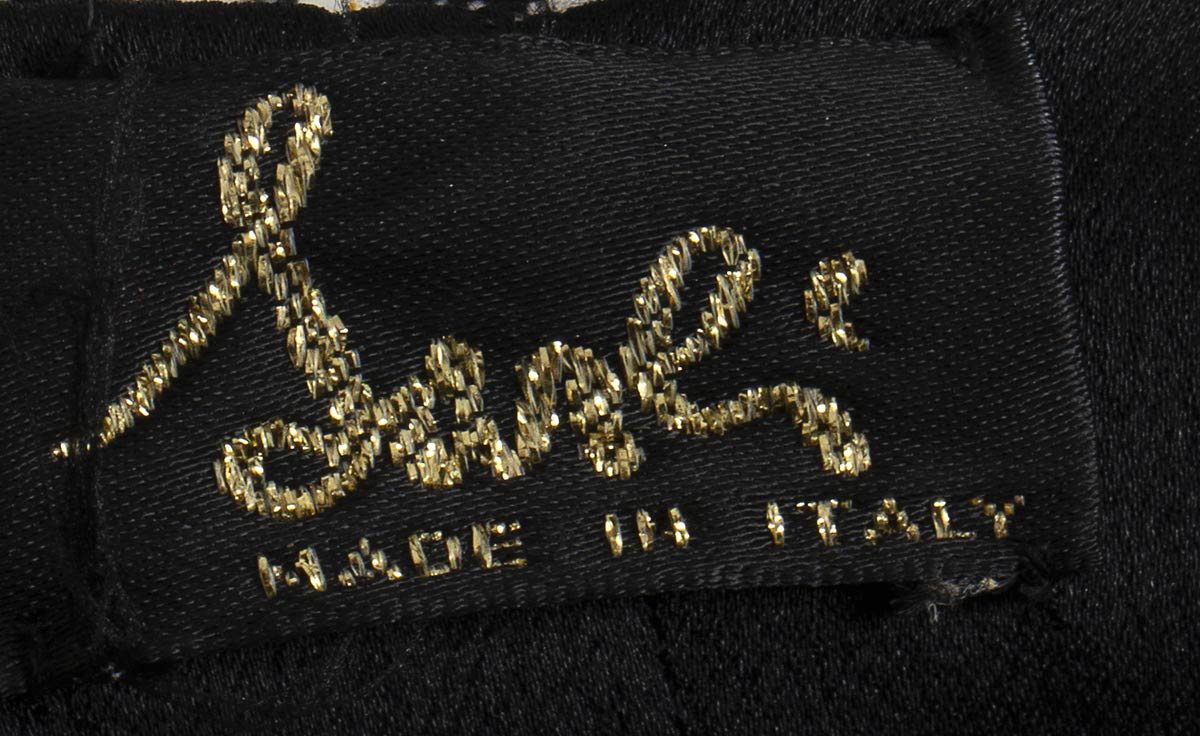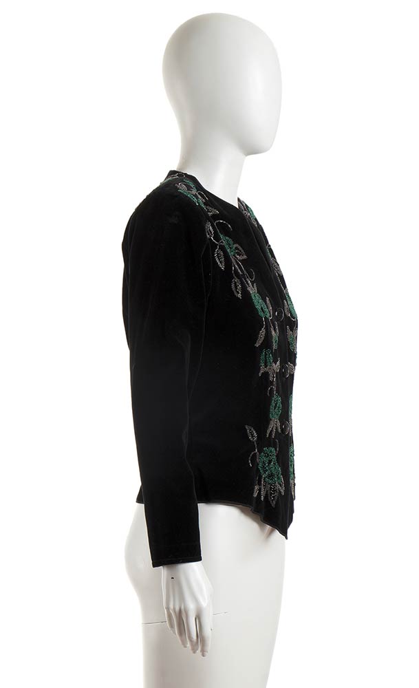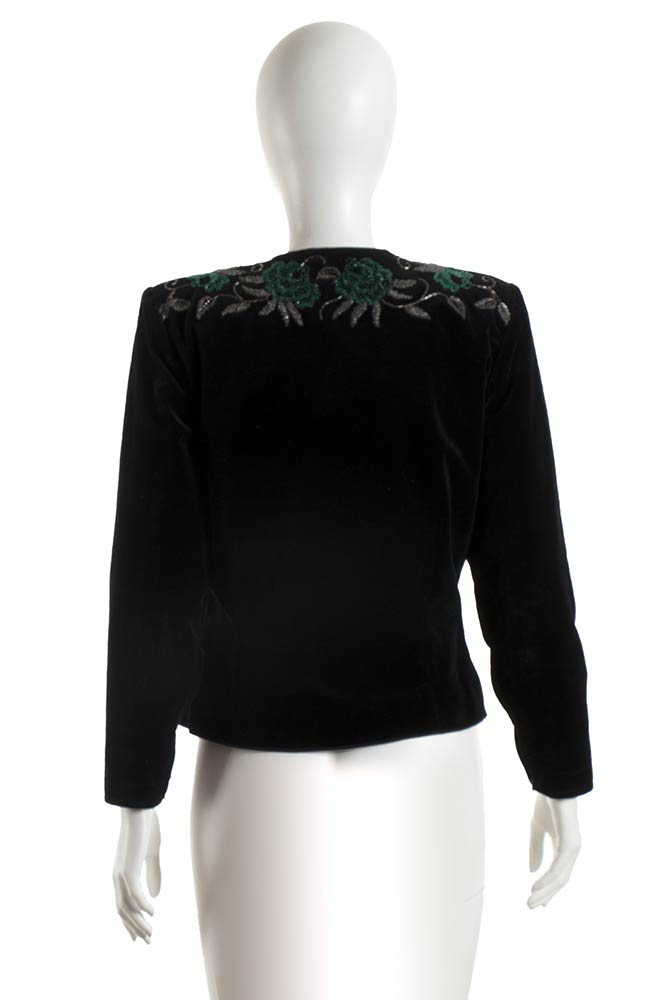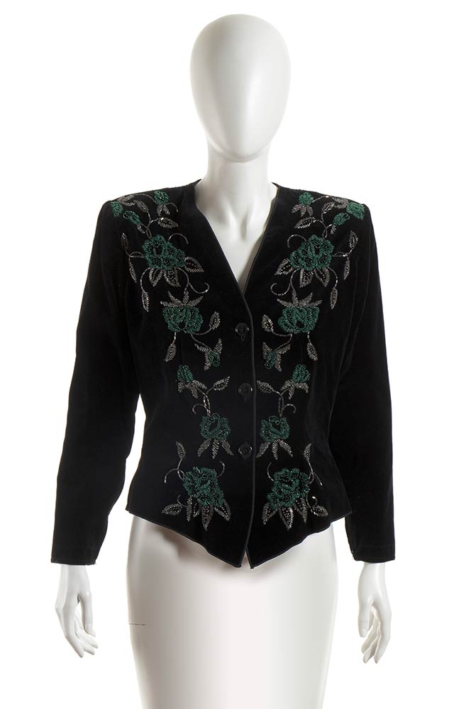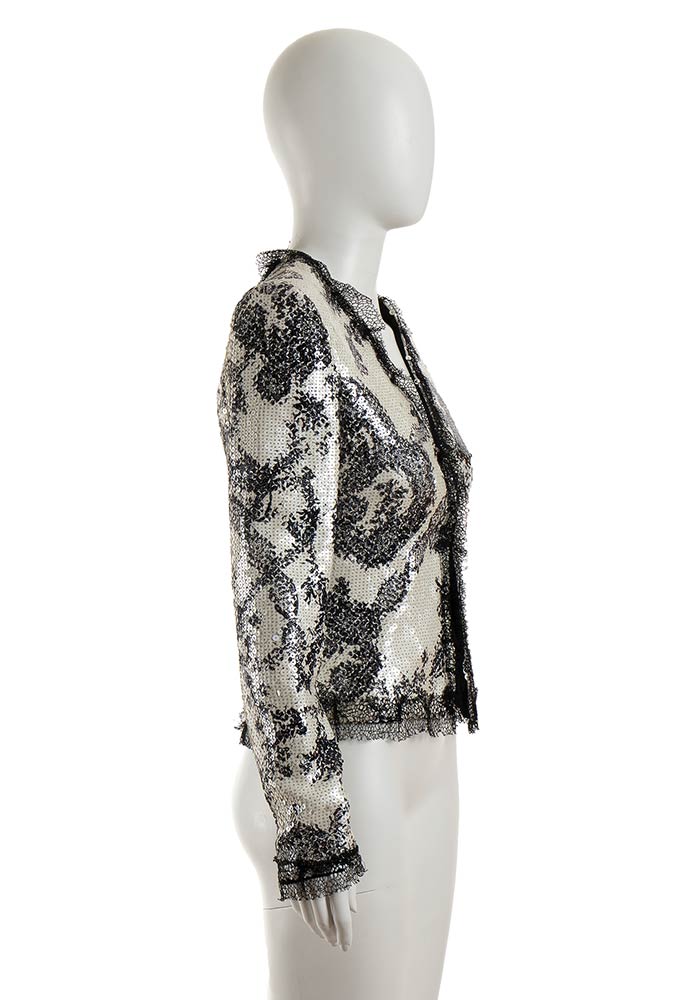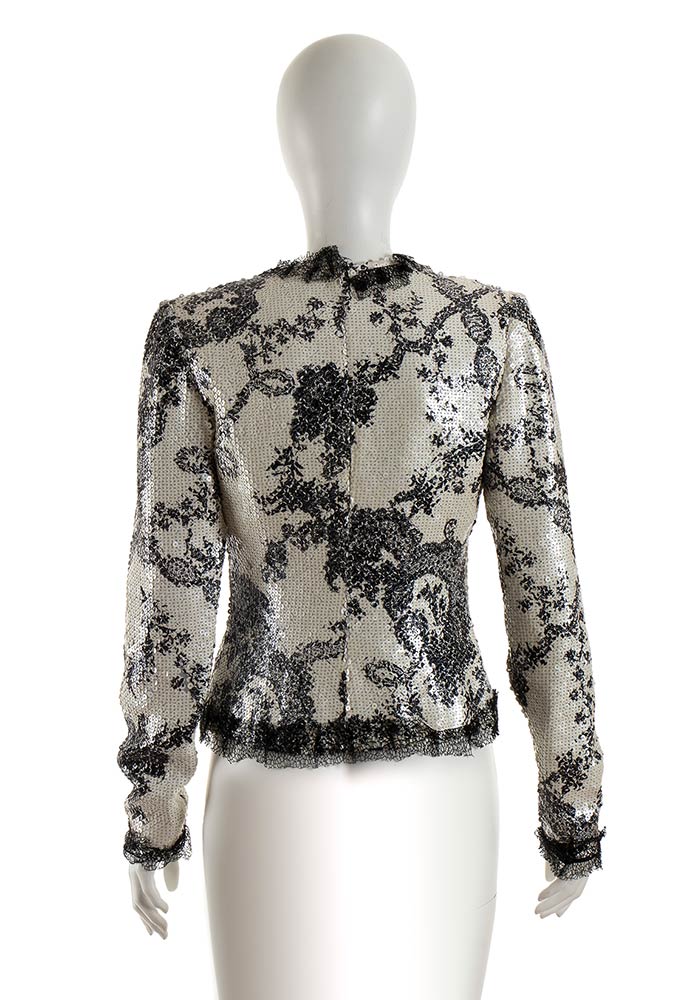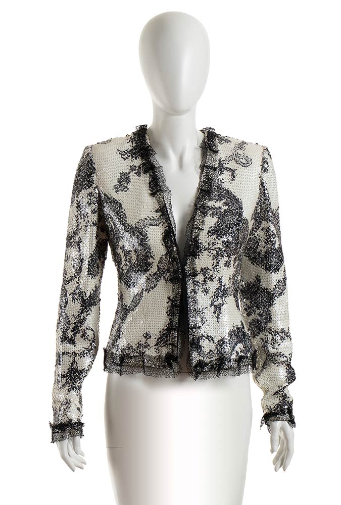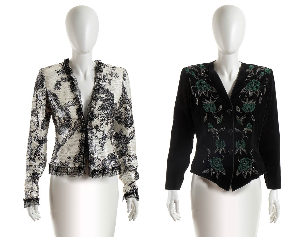 Lotto di 2 giacche 1) Giacca Rocco Barocco in velluto nero e ricami floreali con perline lilla e verdi 2) Giacca Sarli in tessuto completamente rivestito da paillettes bianche e nere, bordi in pizzo nero