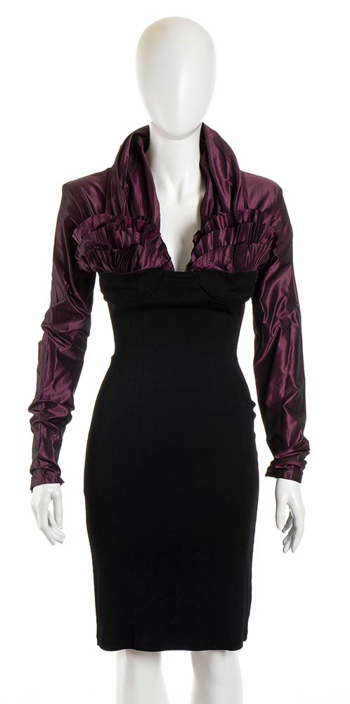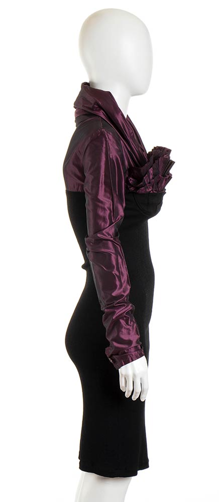 Abiti in tessuto sintetico elasticizzato nero , busto in taffetta sintetico viola, dettagli plissé, Busto 95 cm Vita 75cm