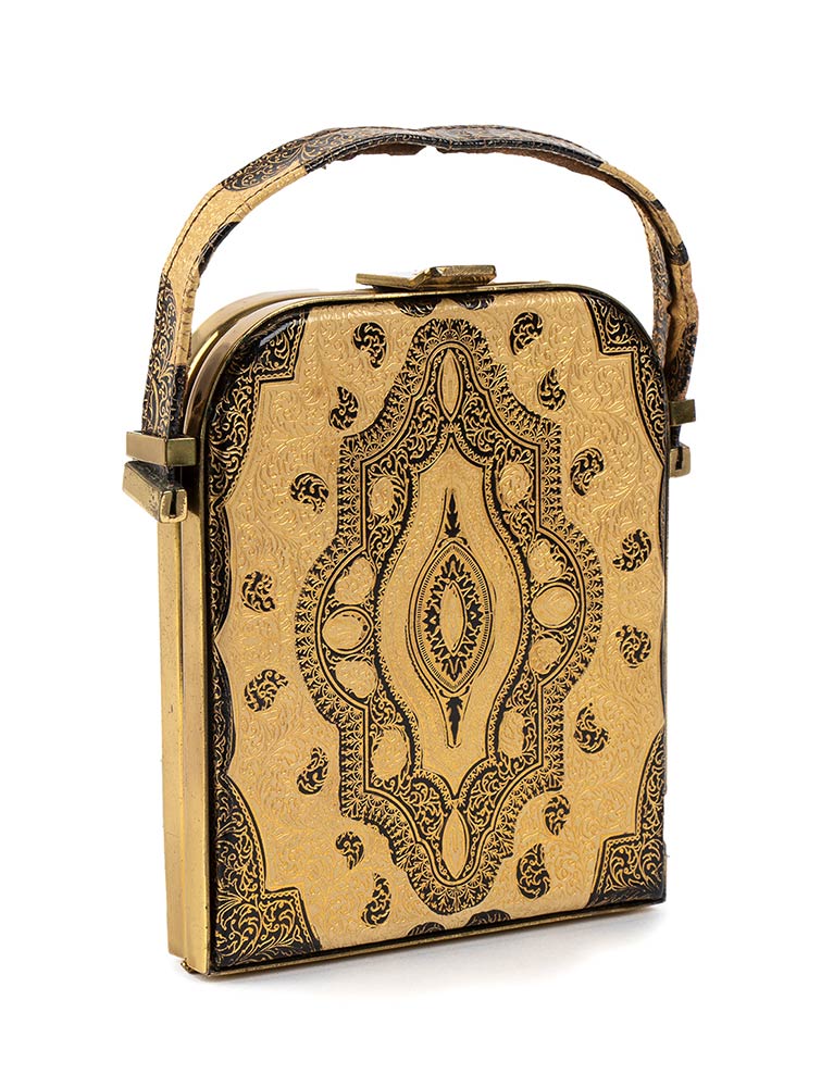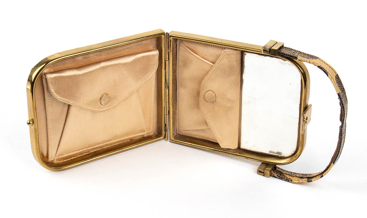 Borsetta in pelle beige e motivi decorativi stampati in nero, manico, interno foderato in seta rosa chiaro, tasche e specchio