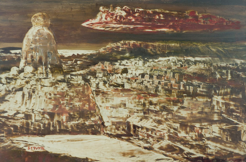 Salvatore Fiume Isola di pietra, anni '60 Olio su masonite, cm. 36x54 Firmato in basso a sinistra. Autentica dell'Artista su foto.