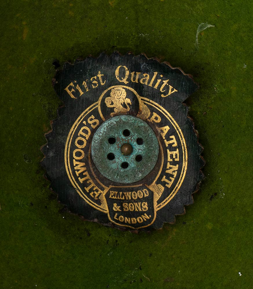 Sughero foderato di tela di cotone bianca con applicato fregio frontale, condizioni medie, difetti e mancanze.