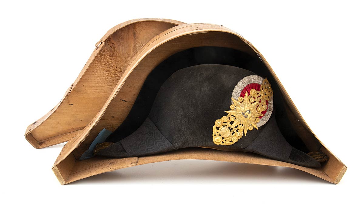 In feltro con ornamntei in piume di struzzo, coccarda bianco-rossa, cappio in metallo dorato con applicata l'insegna dell'ordine, in ottimo stato, conservata in scatola lignea con nome del proprietario, rara ed in ottimo stato.
