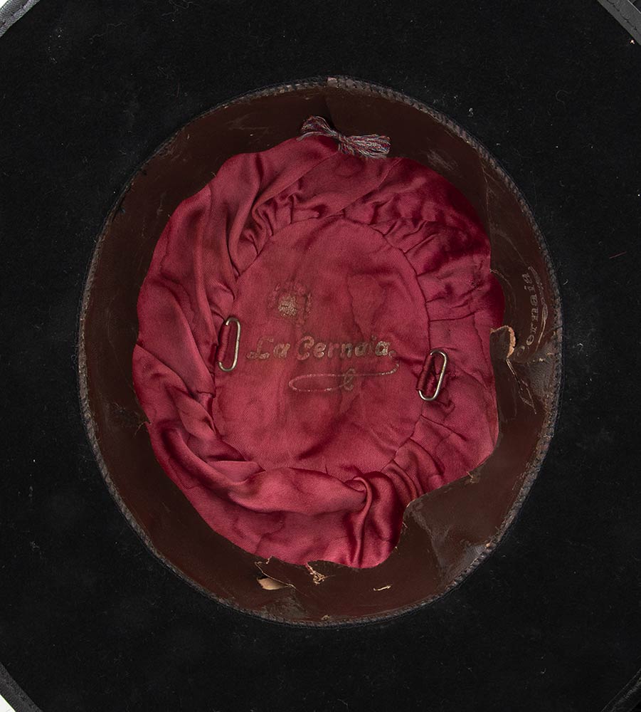 In feltro con falda di tela cerata, interno in seta cremisi ed alluda in pelle, bel mazzo di penne, in buono stato.
