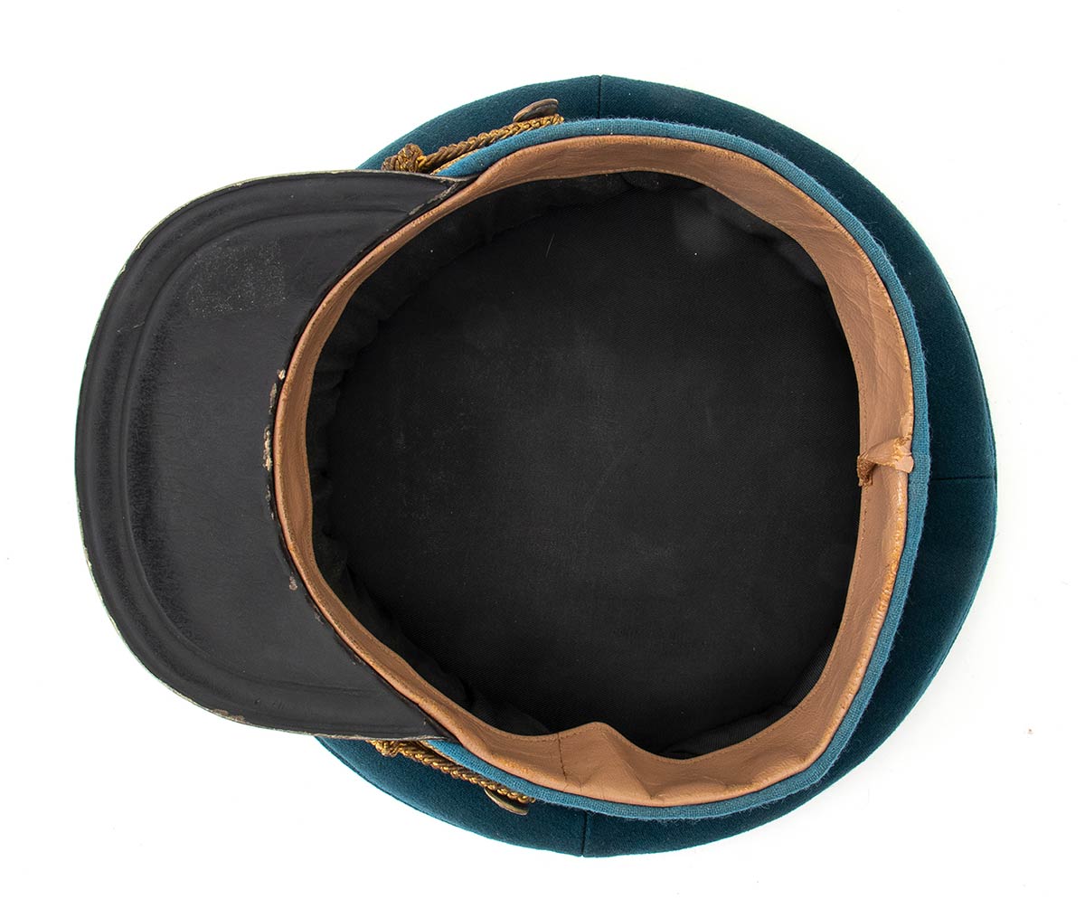 Berretto in panno di lana verde petrolio e fascia azzurra ricamata, questo tipo di berretti furono creati espressamente per la parata della vittoria del Maggio 45 e rimasero in uso fino a metà degli anni '50, in ottimo stato.