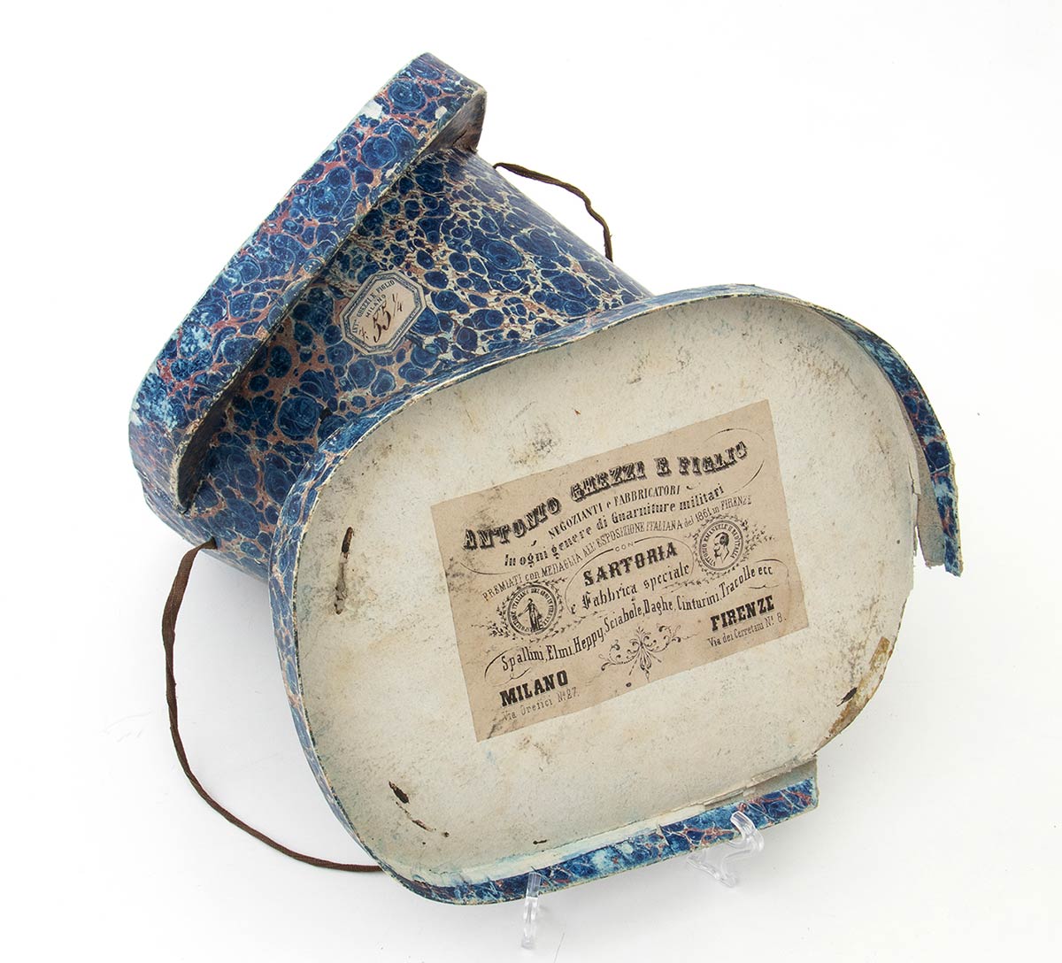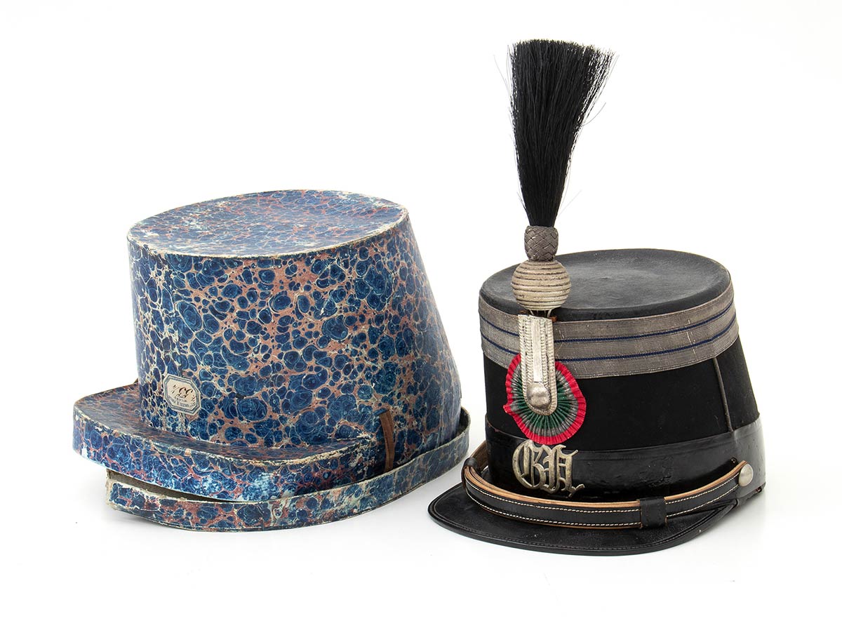 Fusto rigido ricoperto di panno nero, gradi ed insegne reggimentali, , conservato in scatola.