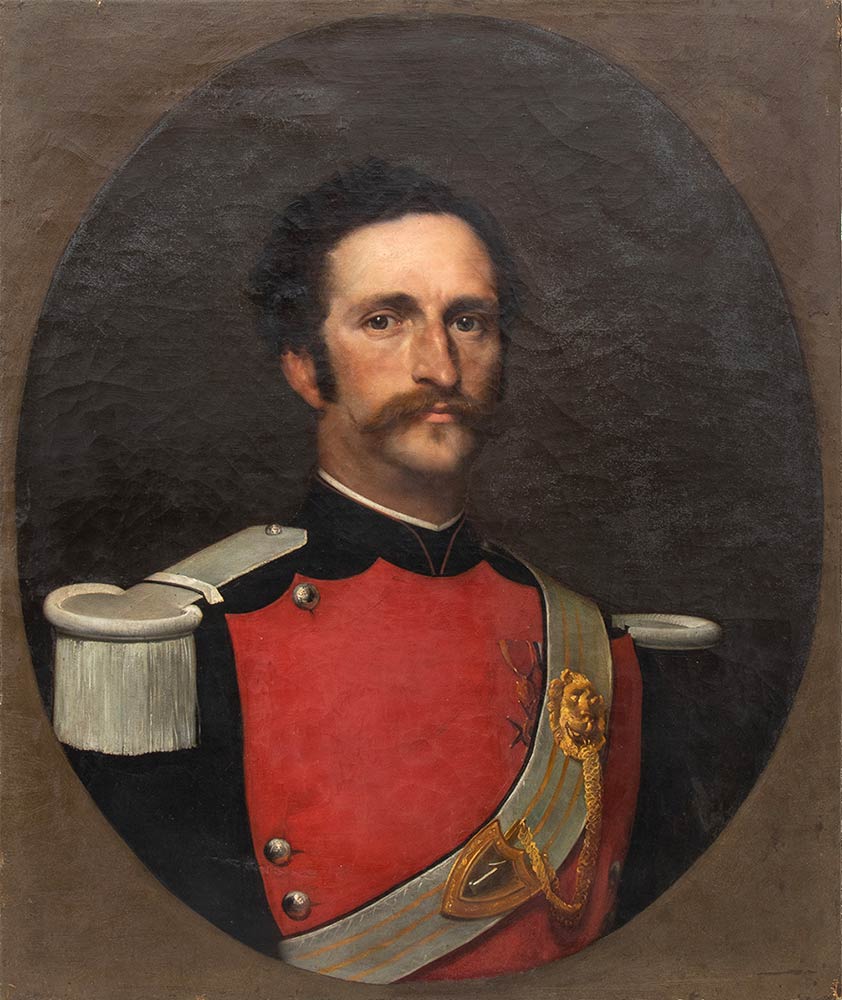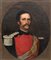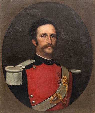 Olio su tela ritae l'ufficiale in tenuta da campagna con bandoliera e decorazione, al retro etichetta d'epoca con nome dell'ufficiale ritratto, raro soggetto, di buona fattura.
