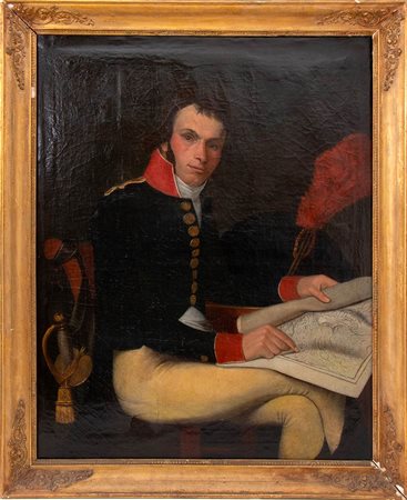 Olio su tela. Il soggetto è raffigurato nell'atto di indicare il percorso dell'avanzata verso Mosca su carta topografica, ad indicare la sua appartenenza alla Grande Armata, molto interessante, con cornice, necessita restauri.