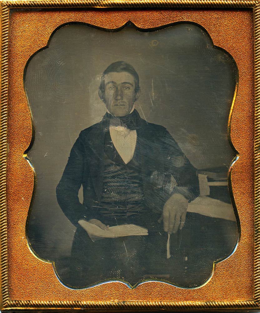 Dagherrotipo “Sixth Plate” completo di cornice e passepartout in ottone. Astuccio in termoplastica (Gutta Percha) con rilievi eseguiti da Frederick Seiler. Nella fotografia un uomo in posa.