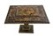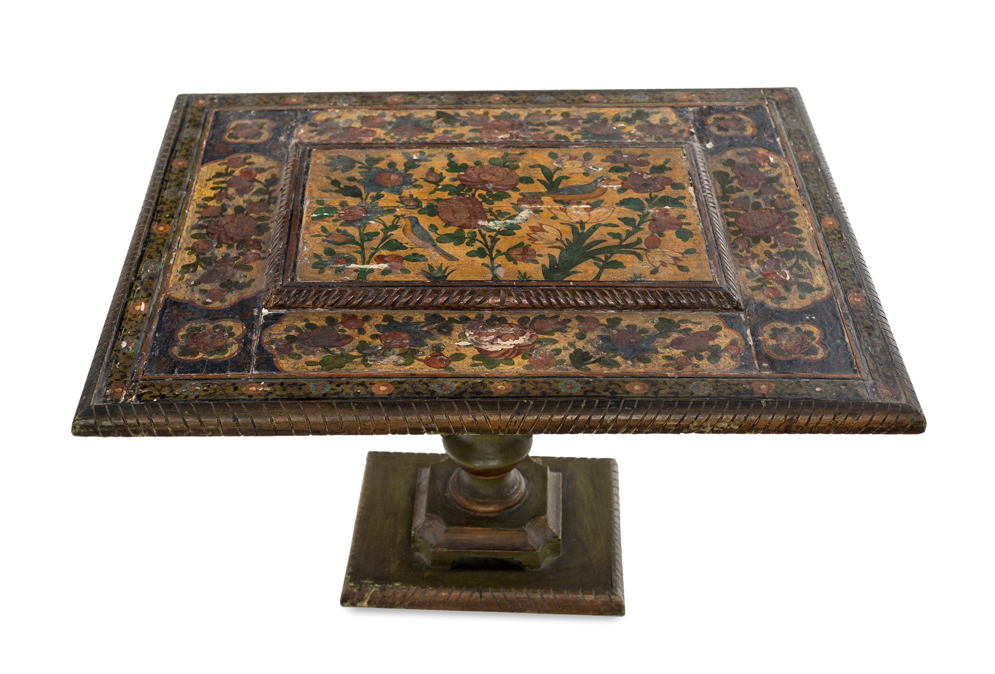 Tavolino basso in legno dipinto costituito da un'antica tavola decorata in vivace policromia su fondo oro poggiante su sostegno in forma di vaso biansato. cm 48x70x83