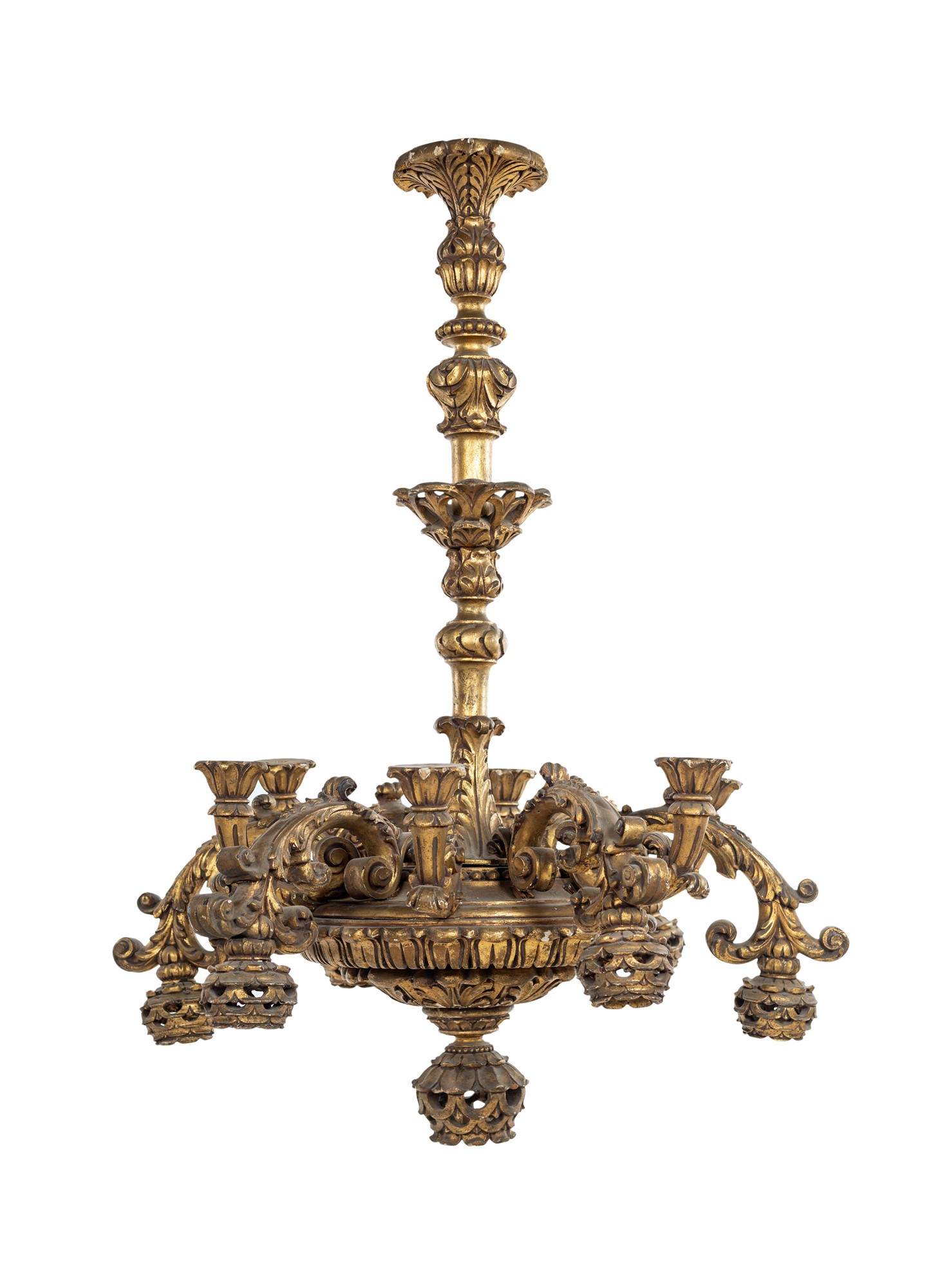 Grande lampadario in legno intagliato e dorato a tredici luci disposte sulla sommità di bracci rivolti alternatamente verso l'alto e verso il basso. XIX secolo. altezza cm 135x98