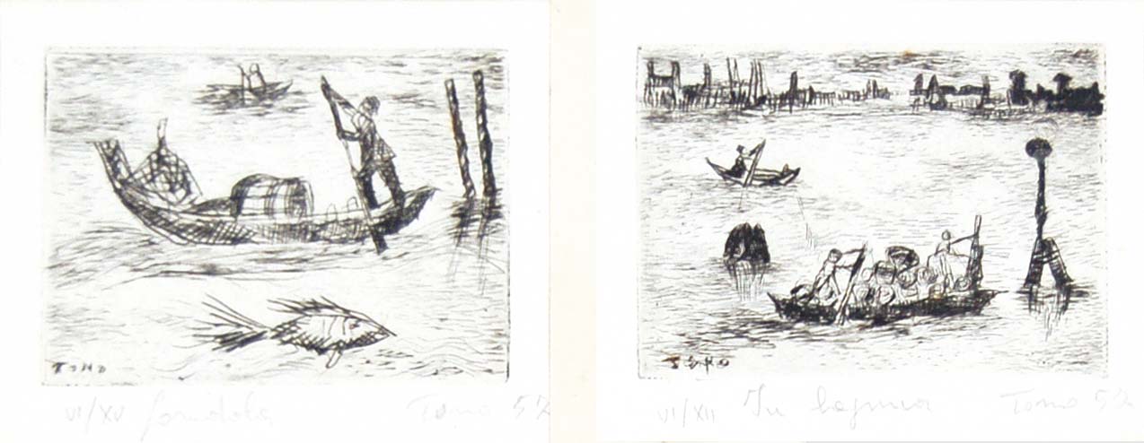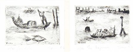 ZANCANARO TONO Padova 1906 - 1985 Gondola 1957 - In laguna 1957 lotto di 2 acqueforti es. VI/XV e VI/XII in unica cornice 8x11 (lastra) cad. cm firma data titolo e tiratura in basso in entrambe