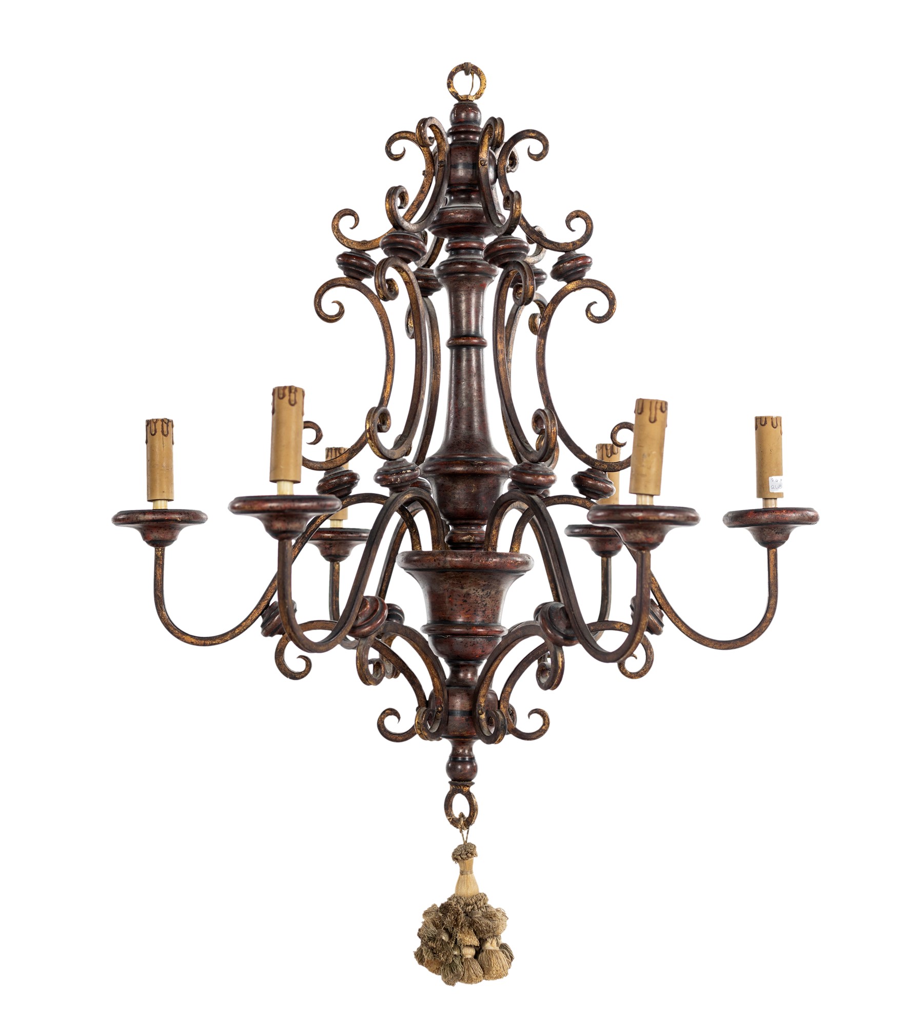 Lampadario a sei luci con braccetti sagomati in ferro disposti intorno al montante centrale in legno tornito. altezza cm 100x70