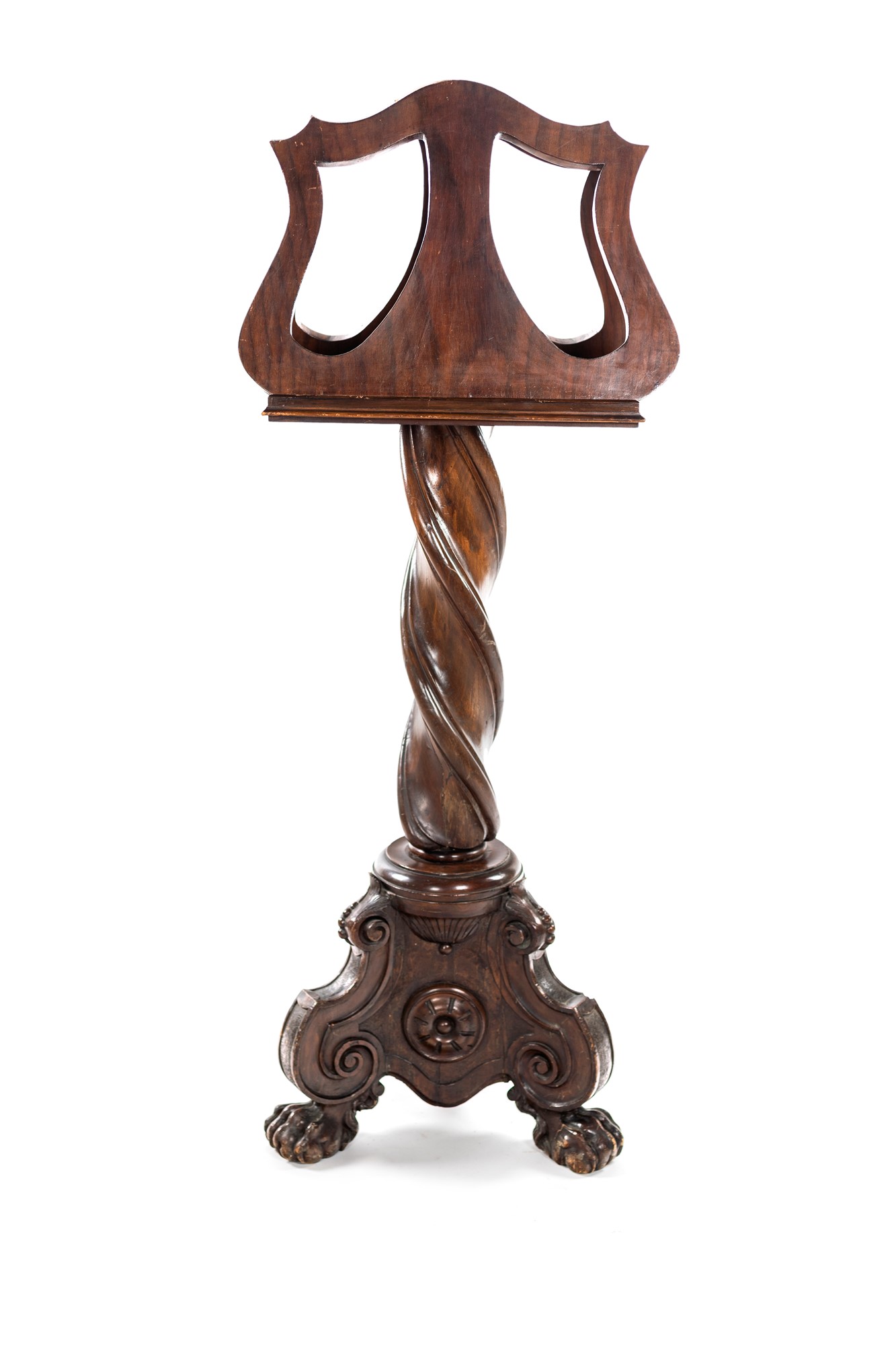Grande leggio in noce, XIX secolo con doppio piano inclinato poggiante su alto sostegno tortile. cm 160x61x50