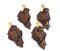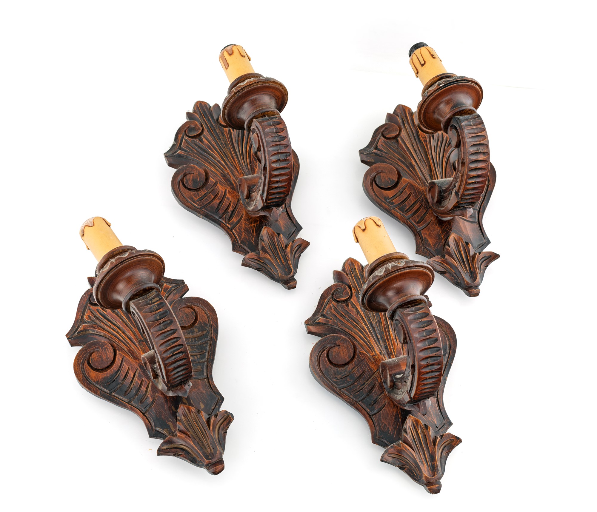 Quattro appliques in legno patinato ad una luce con supporto a forma di scudo da cui si diparte un braccetto arcuato reggicandela. cm 27x15x18