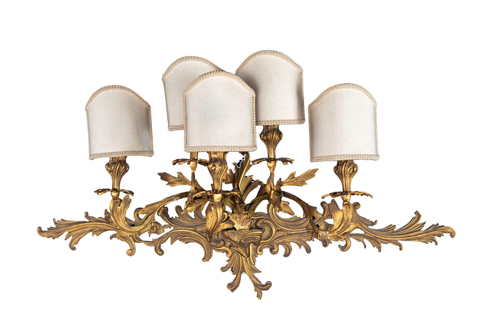 Grande applique in bronzo dorato a cinque luci con bracci sagomati a forma di ramo fogliato emergenti dal centro del supporto parietale costituito da volute vegetali, XIX secolo. cm 48x90x30