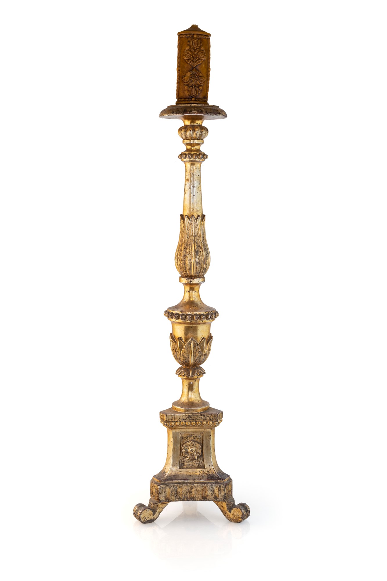 Torciera in legno dorato con fusto a balaustro ornato da più ordini di rilievi vegetali su base tripode centrata da corolla. XIX secolo. altezza cm 90