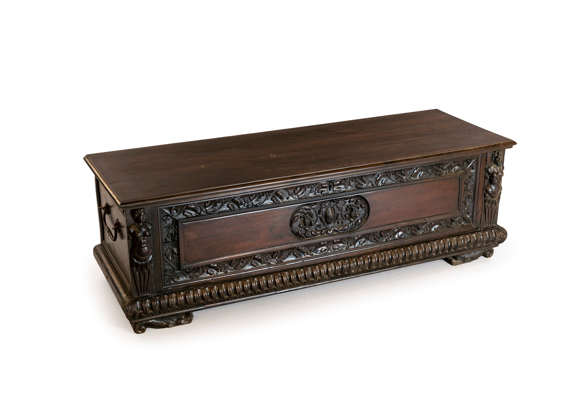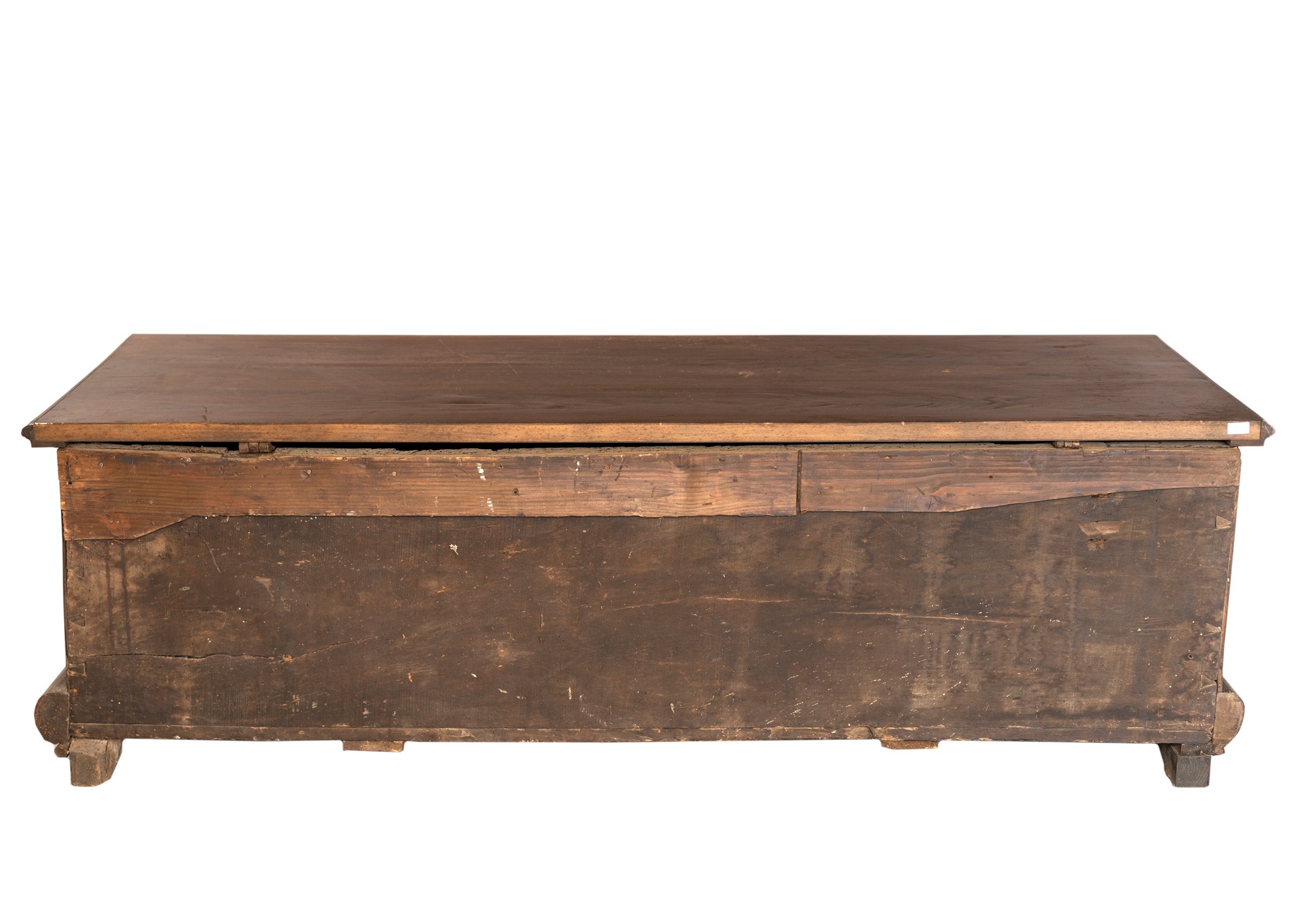 Cassone in legno di noce, Italia XVII secolo Difetti e sostituzioni. cm 54x163x56