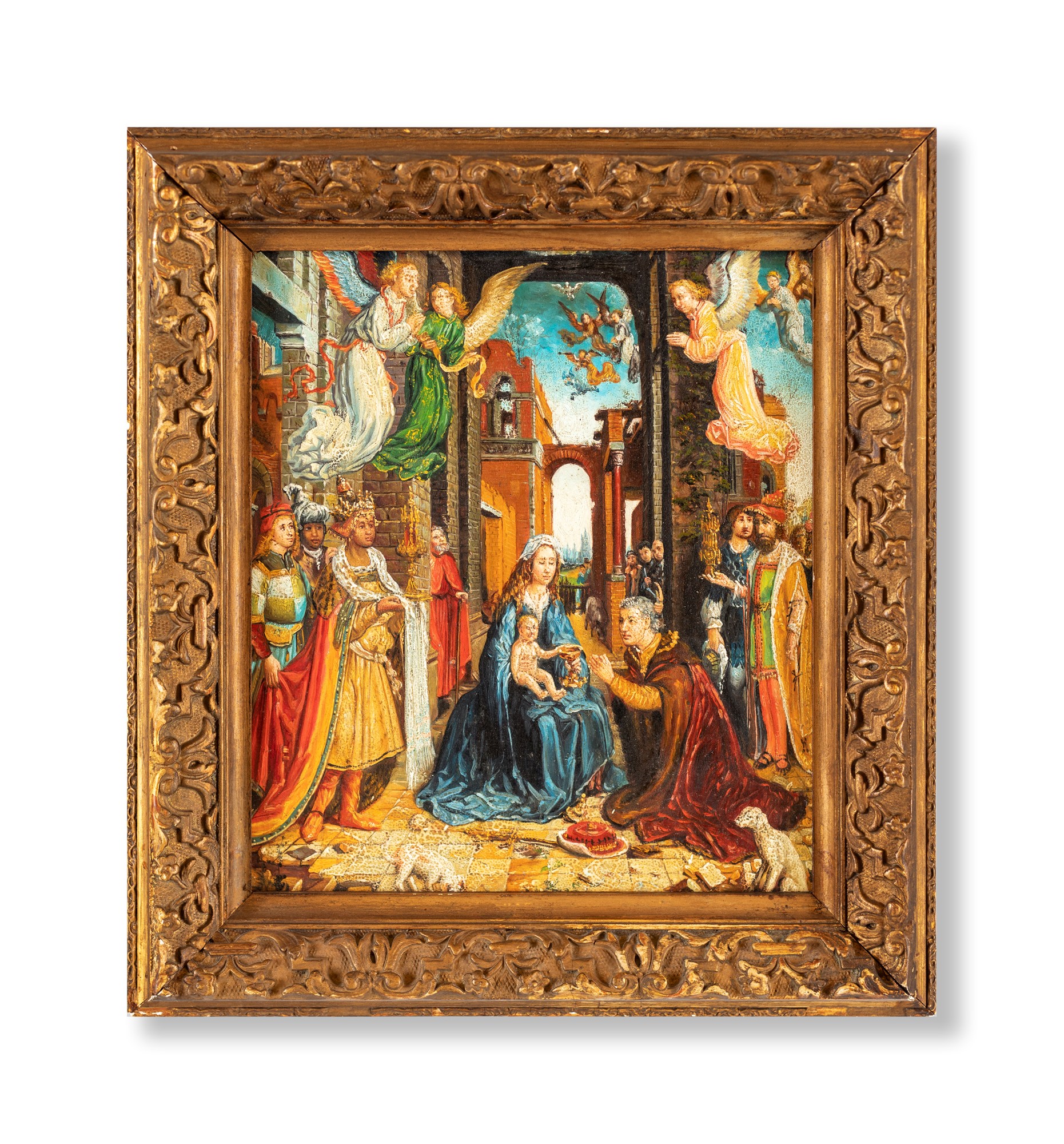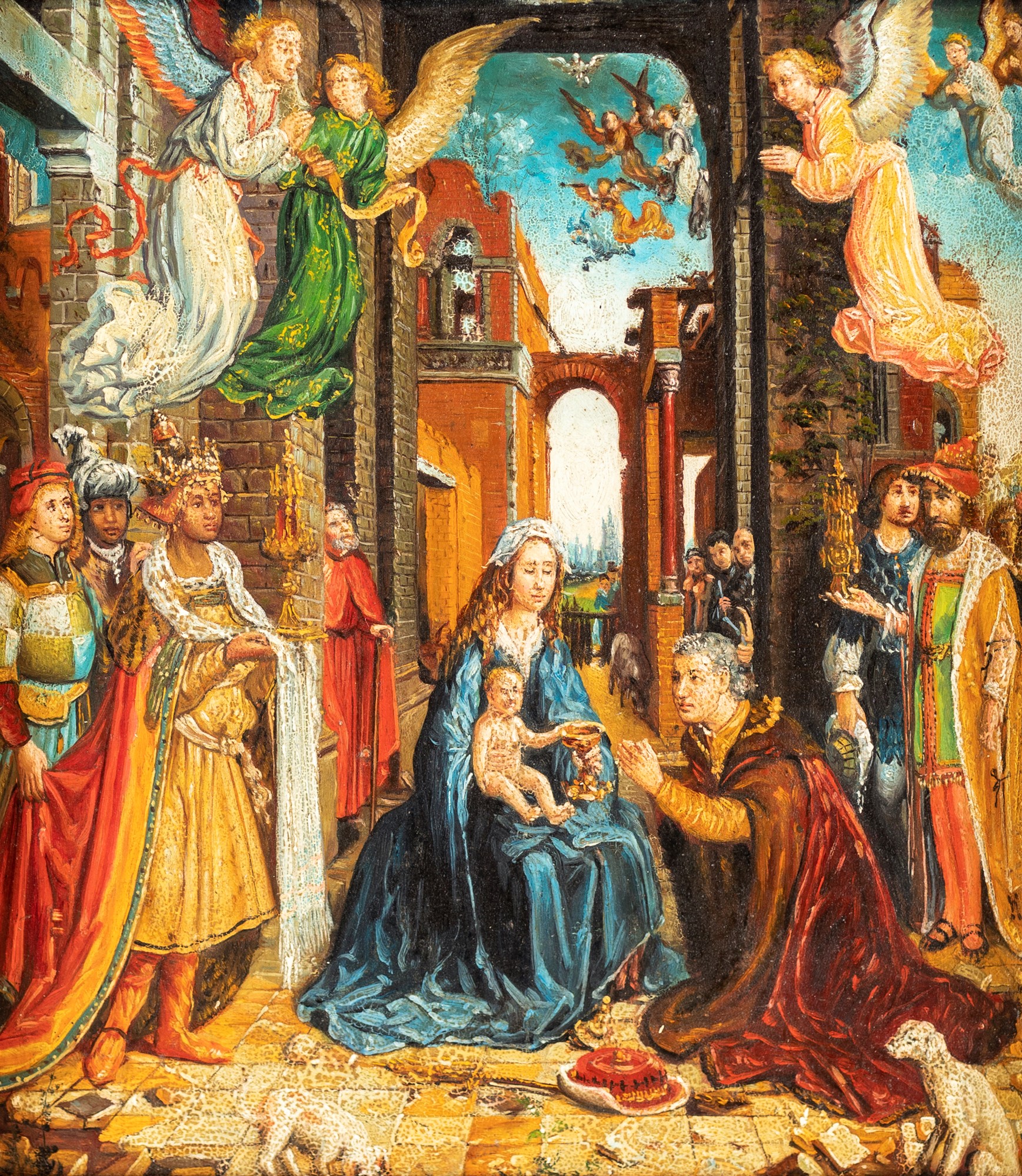 Pittore Fiammingo del XIX secolo Adorazione dei Magi (da Jan Gossaert) olio su rame cm 24x21